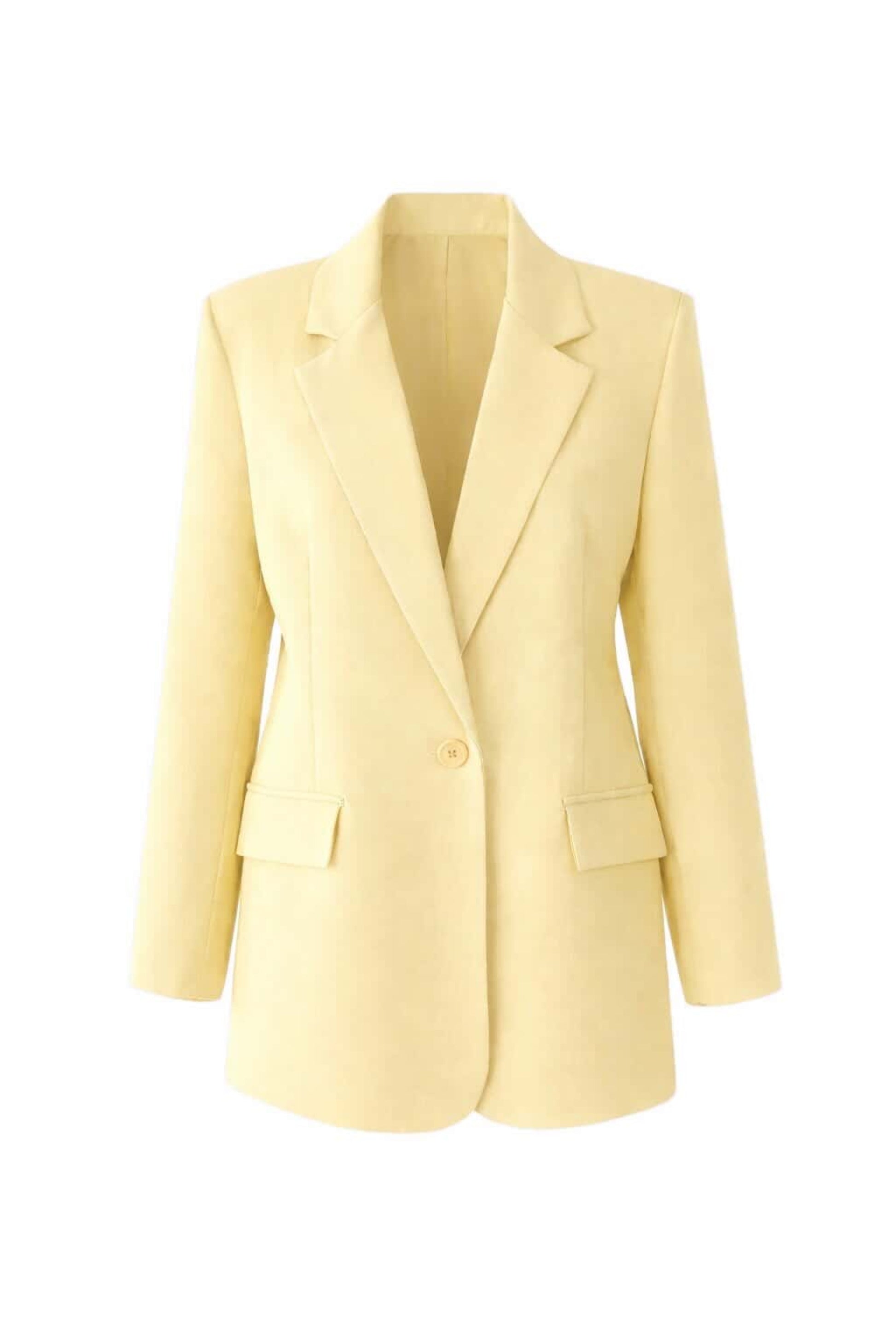 Blazer básica de cuello solapa y manga larga con hombreras. Bolsillos decorativos delanteros con solapa. Cierre frontal con un botón.