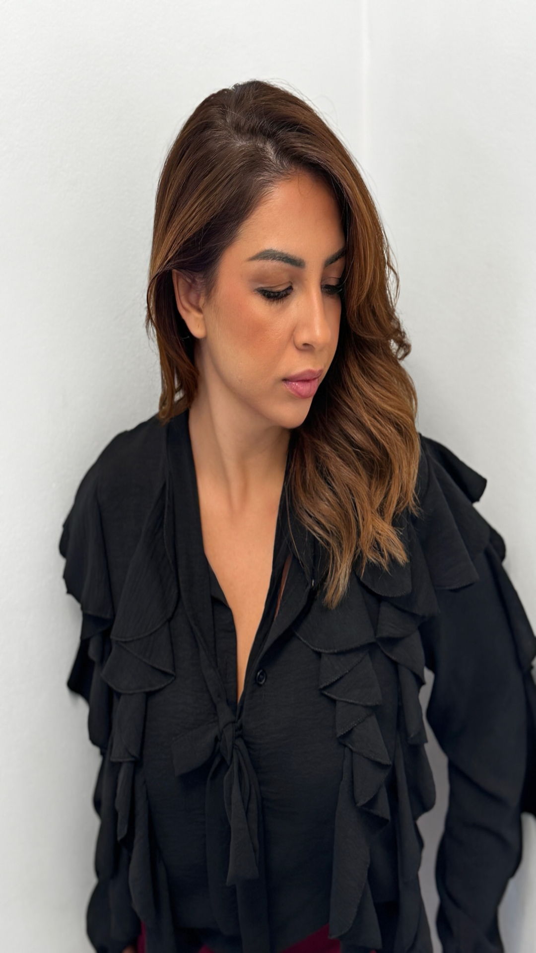 Camisa de cuello redondo con lazo. Escote pico y manga larga. Detalle de acabados con volantes. Cierre frontal con botones a tono.