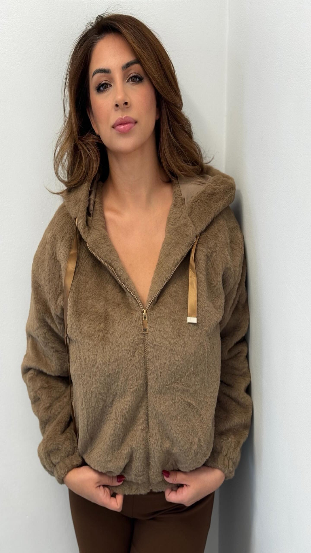 Cazadora confeccionada con tejido de efecto pelo. Con capucha, acabada en puño elástico. Bolsillos laterales. Bajo elástico. Cierre frontal con cremallera. Hombro caído.