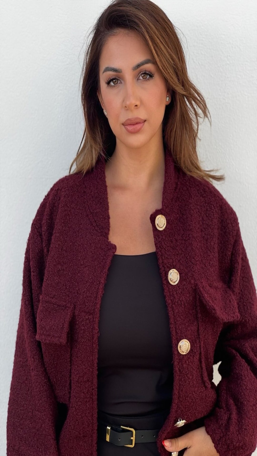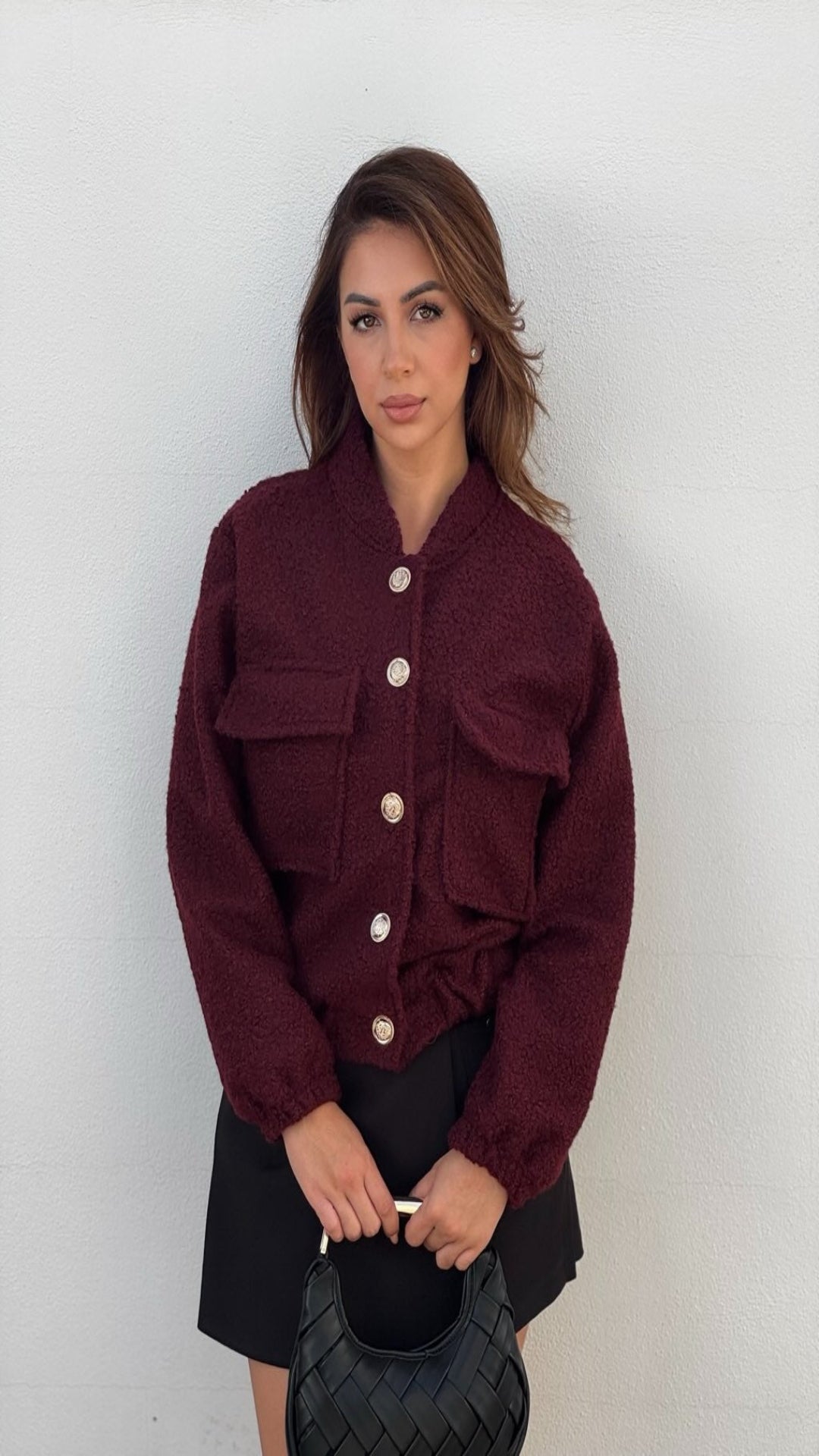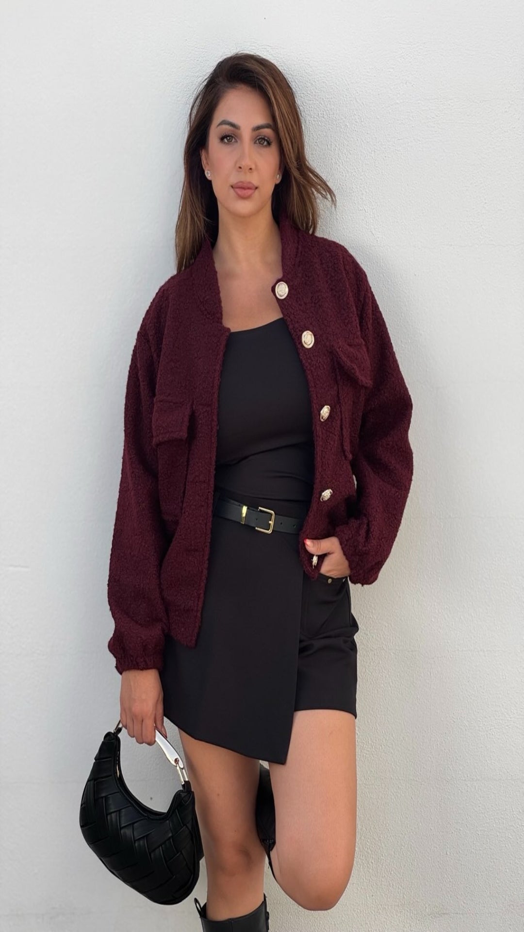 Cazadora relaxed fit confeccionado en tejido con estructura y acabado bouclé. Cuello solapa y manga larga .Bolsillos de vivo en cadera. Acabados con elástico. Cierre frontal con botones dorados.