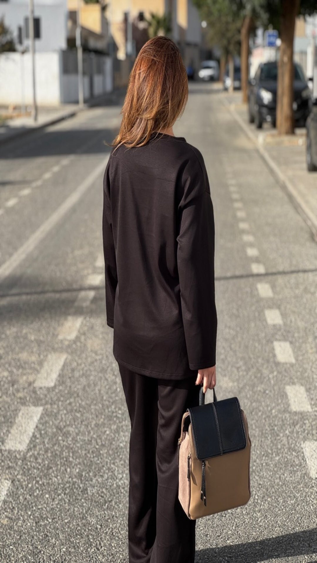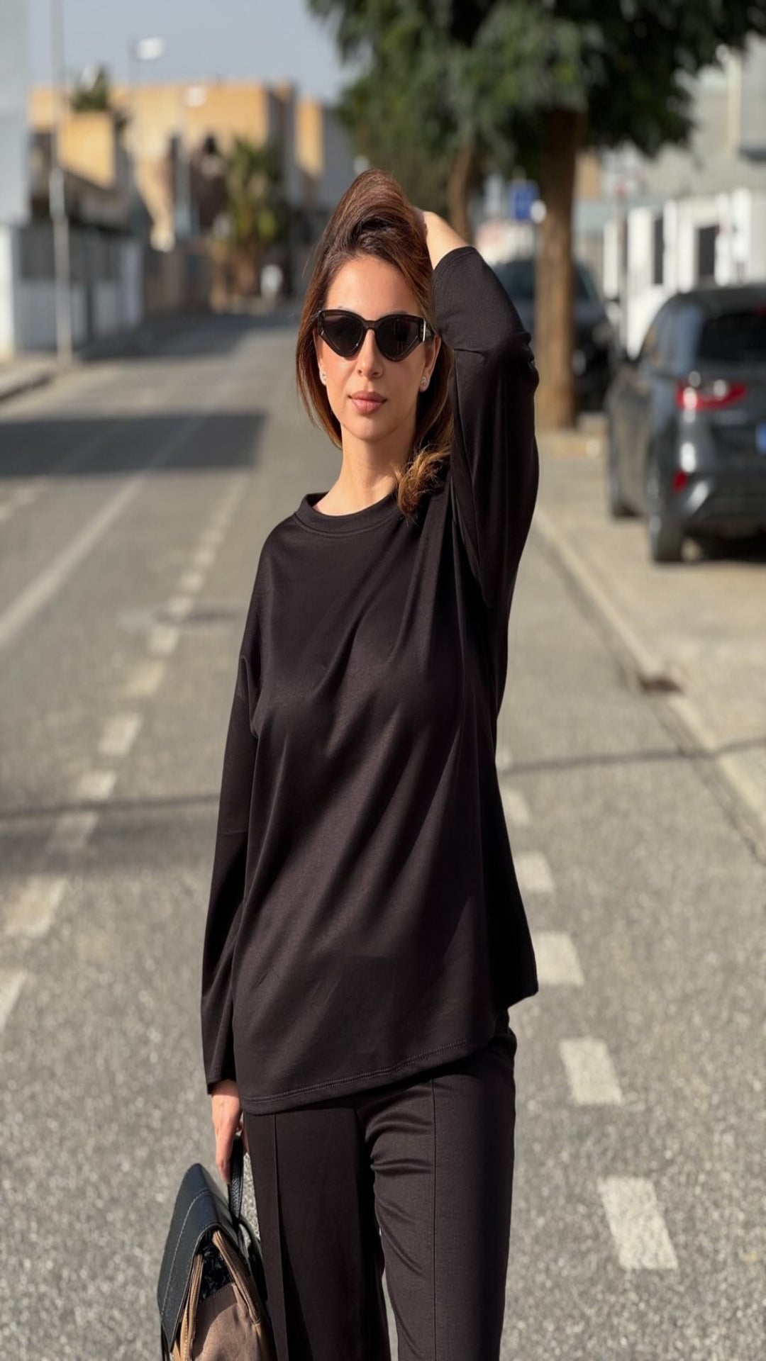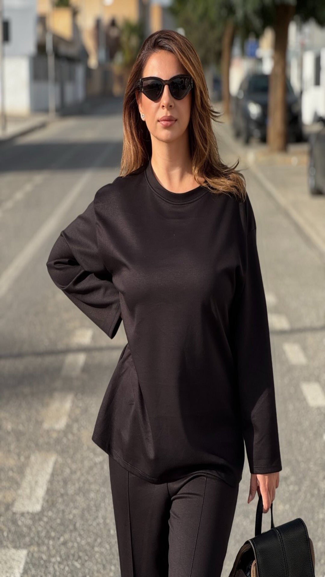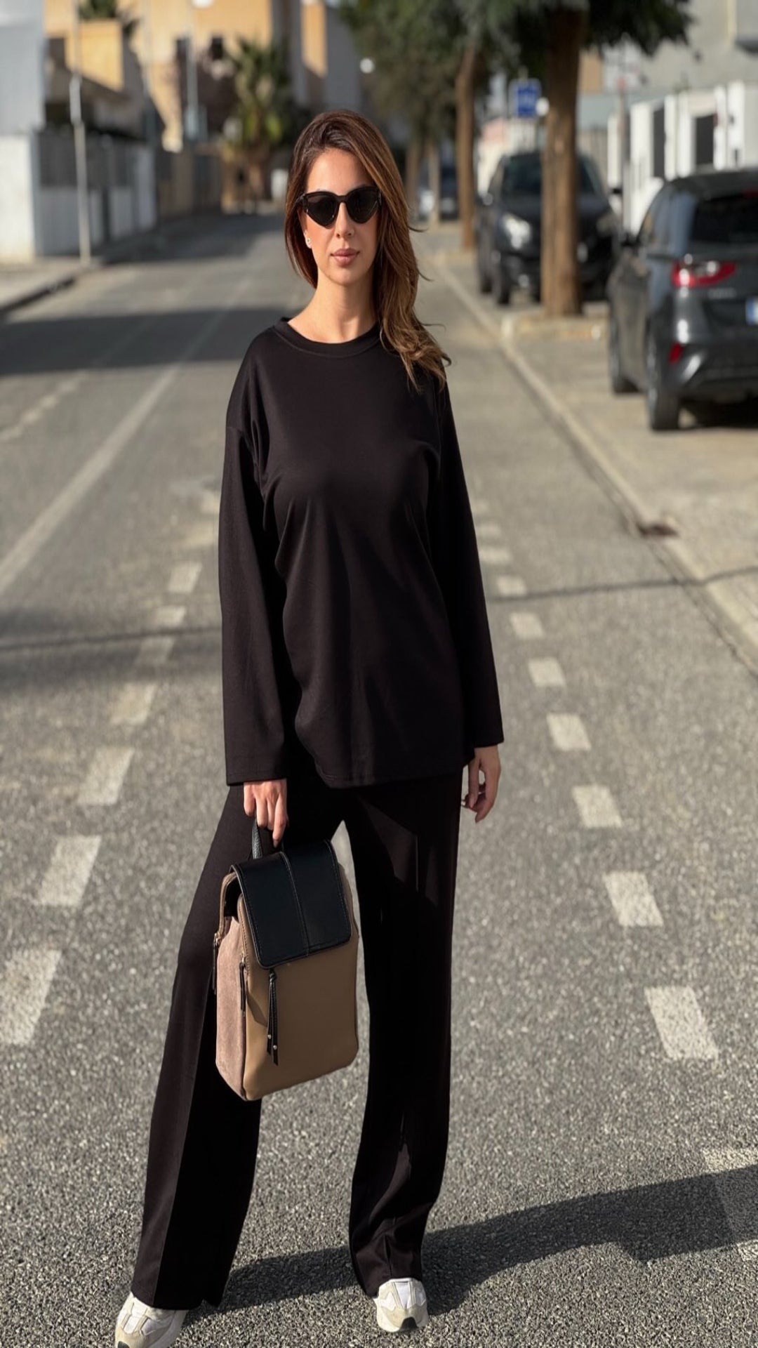 Conjunto de sudadera y pantalón de estilo básico. Tejido soft .Sudadera oversize de cuello redondo y manga larga. Pantalón de corte recto con cintura elástica.