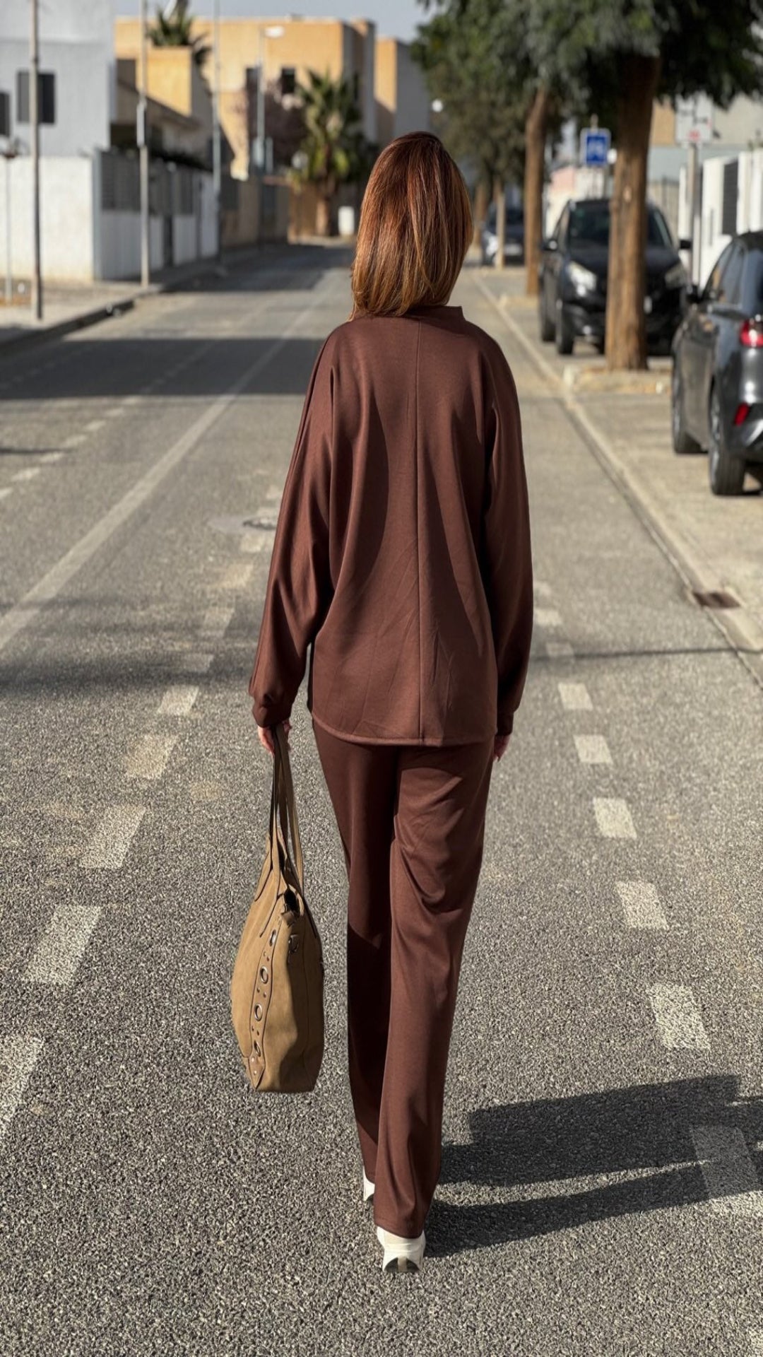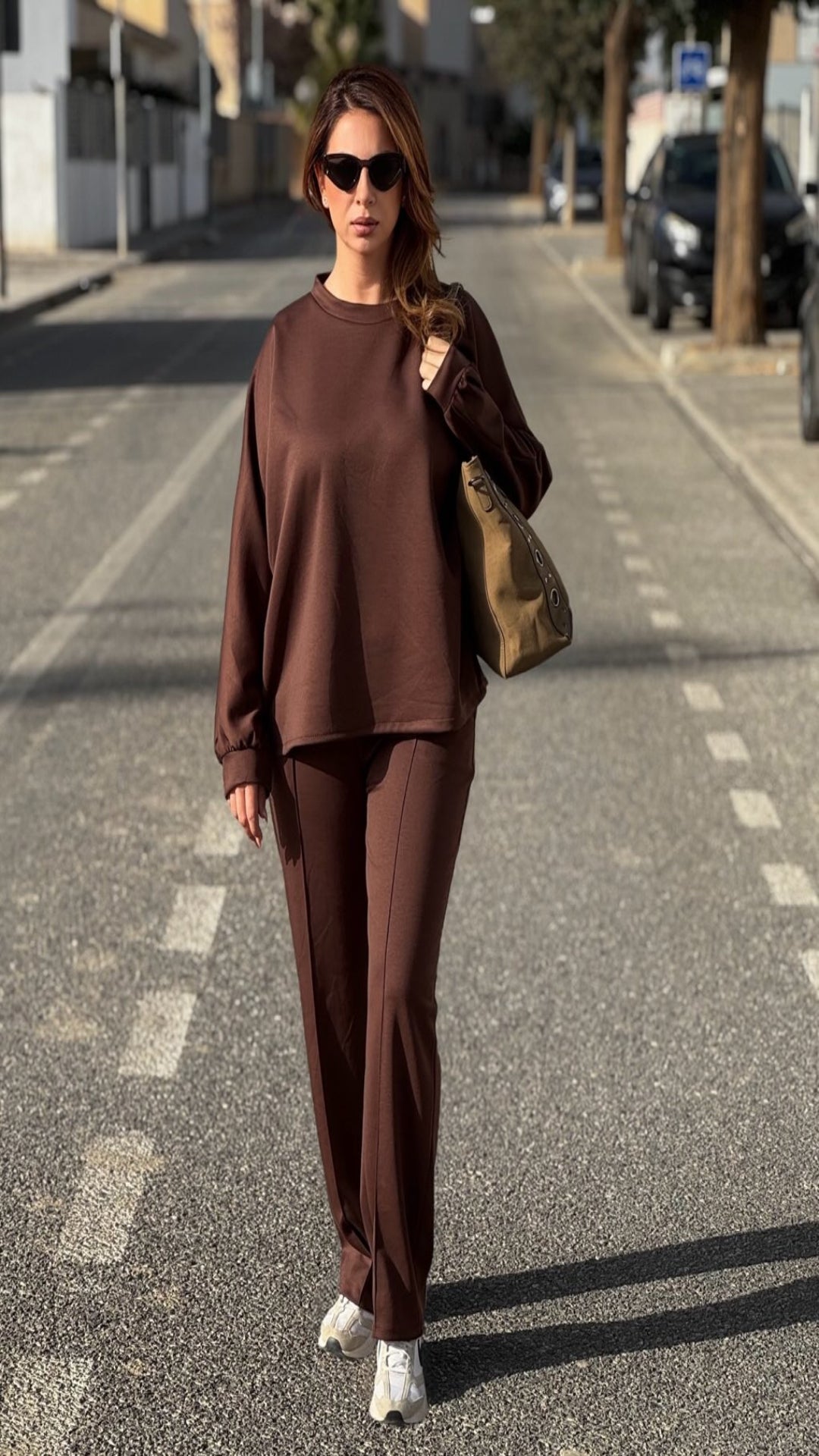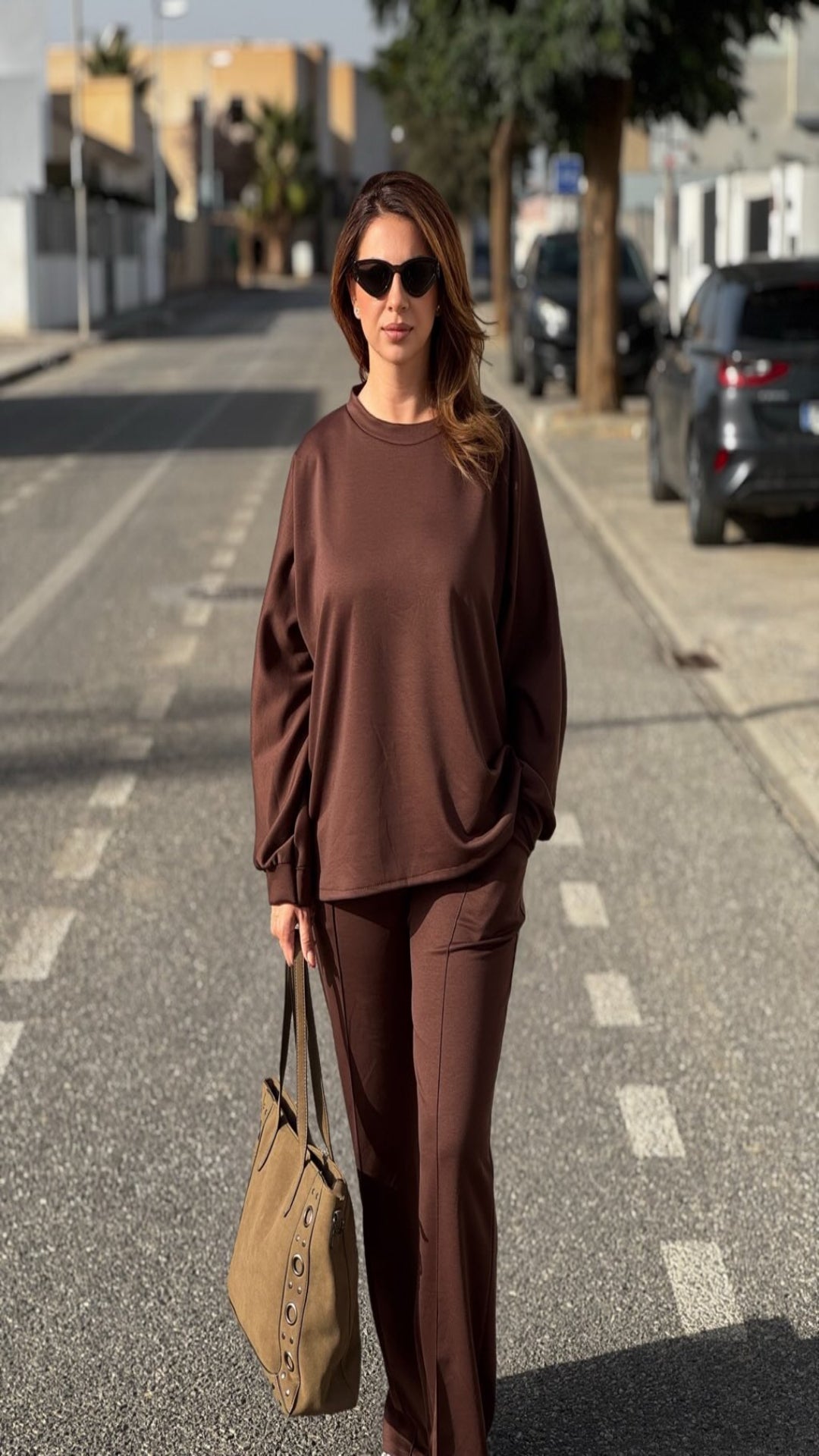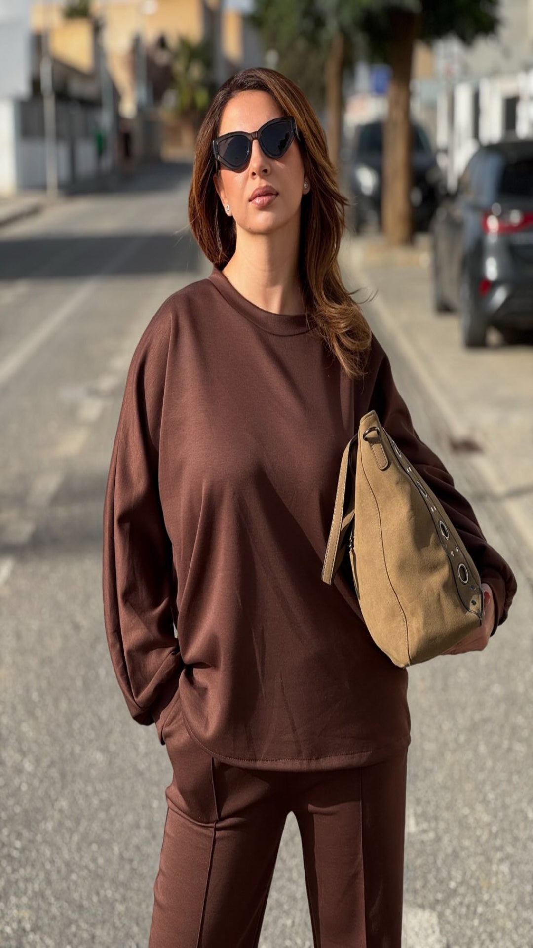 Conjunto de sudadera y pantalón de estilo básico. Tejido soft .Sudadera oversize de cuello redondo y manga larga. Pantalón de corte recto con cintura elástica.