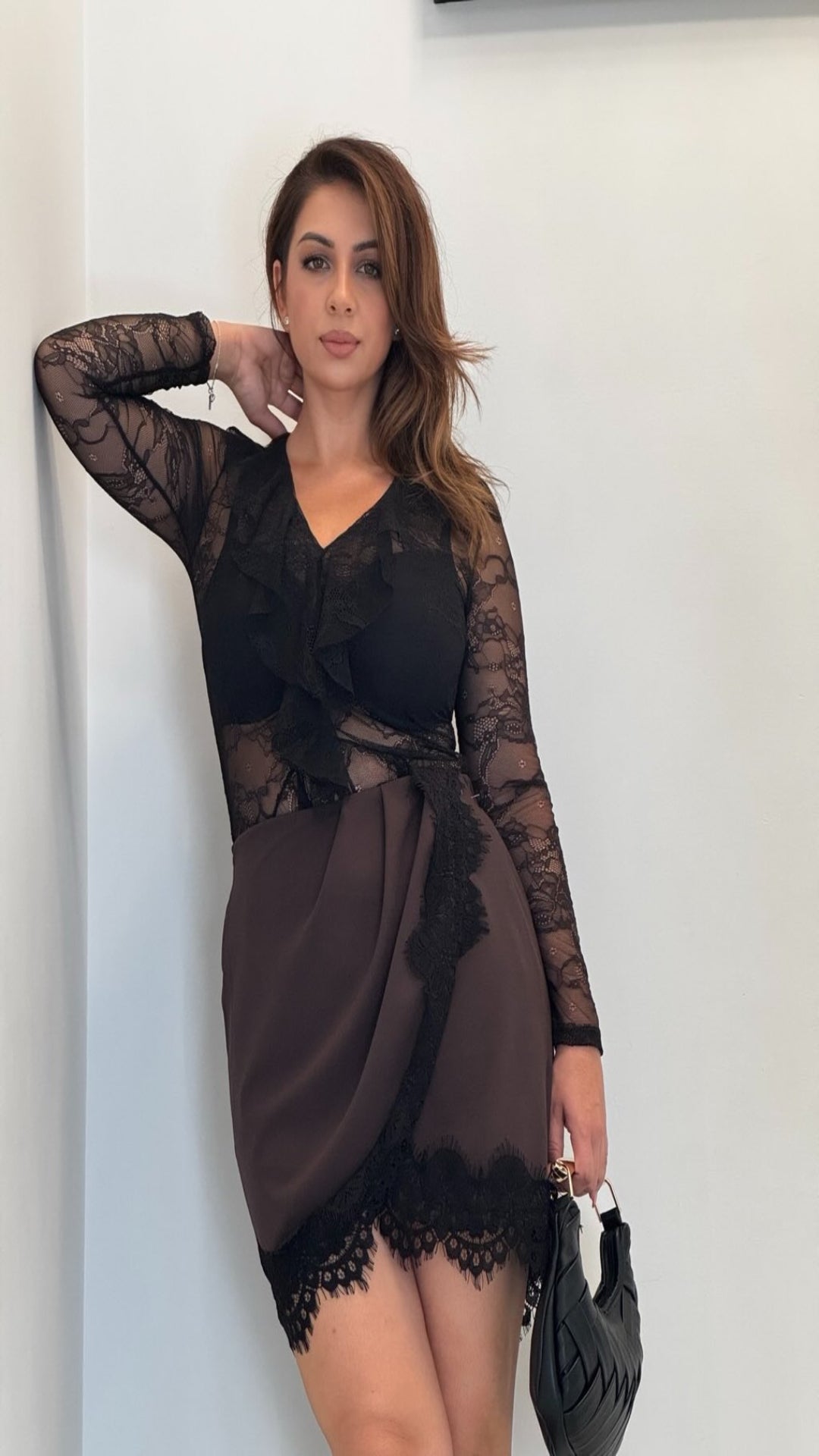 Falda mini marrón de tiro alto con cintura elástico . Delantero cruzado Bajo acabado en encaje a tono negro.