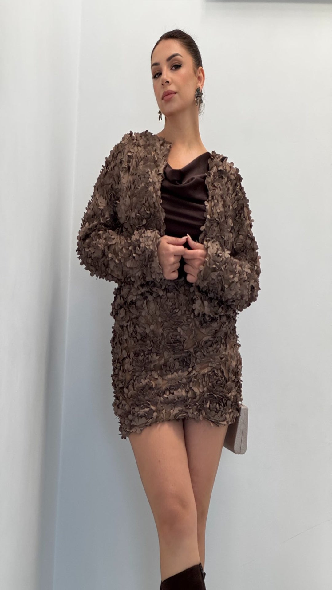 Falda corta de tiro medio con diseño floral en relieve. Forro interior. Cintura elástica.