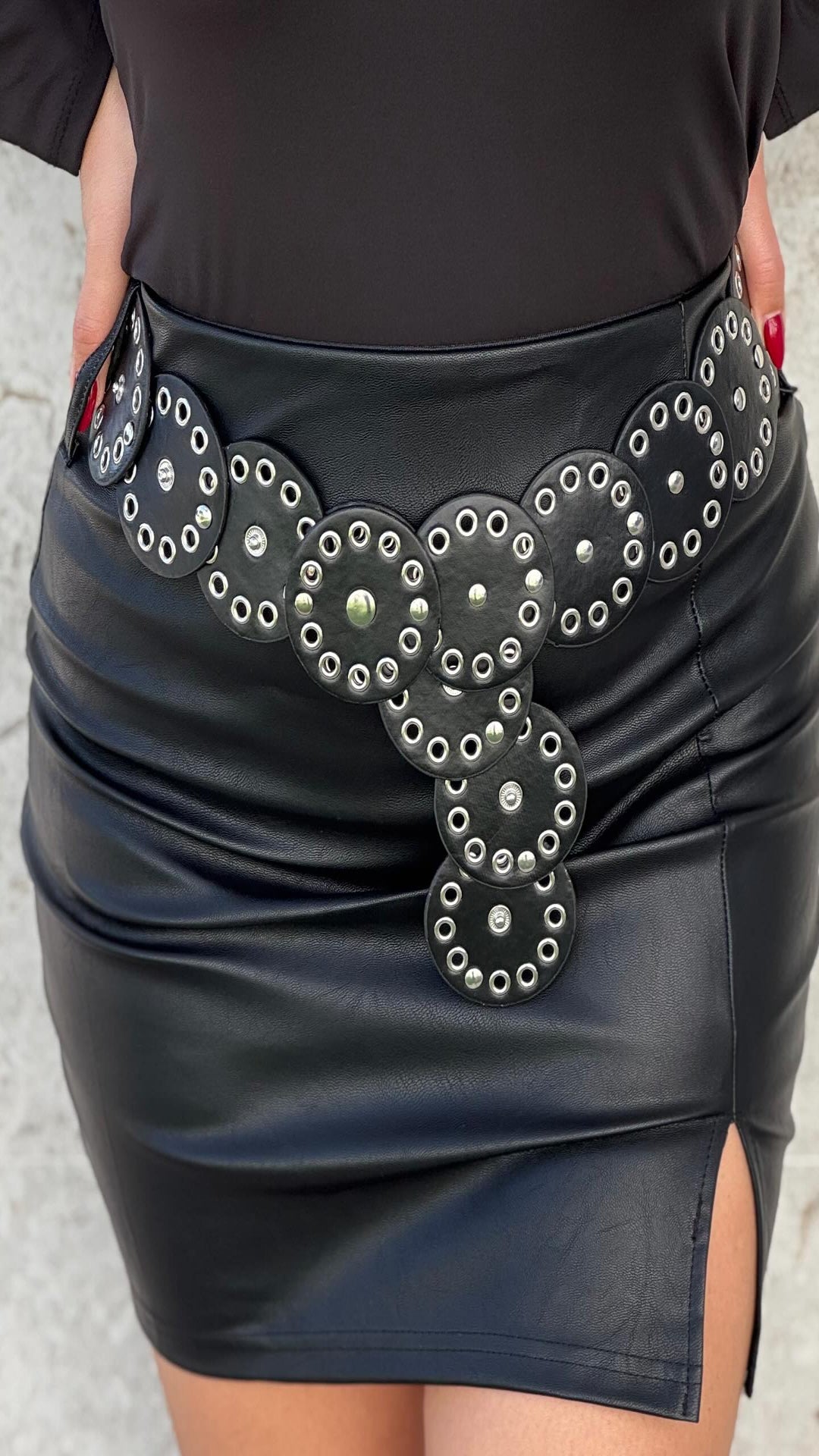 Falda mini polipiel con cintura elástica, tiene abertura lateral. Incluye cinturón chapa tachas.