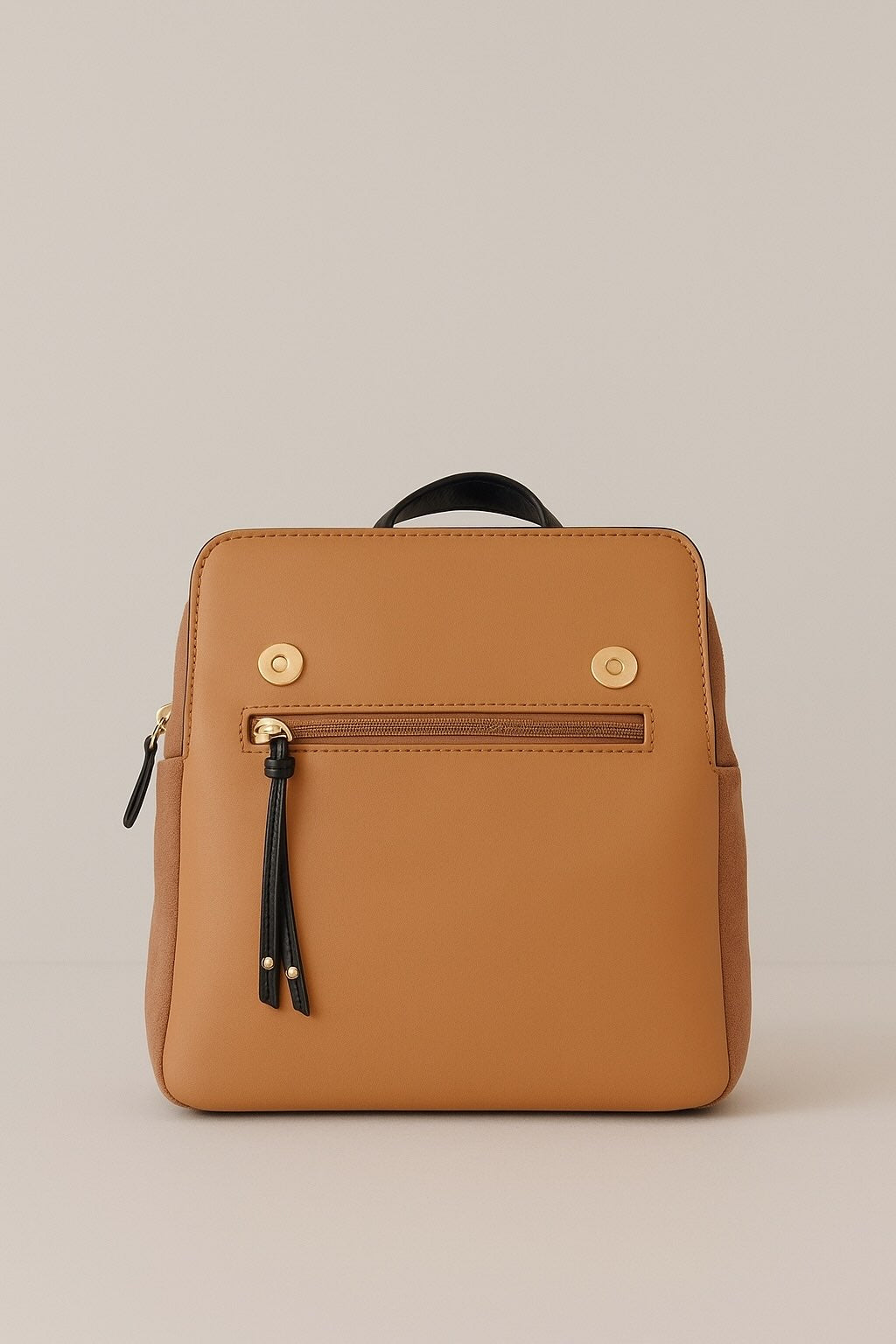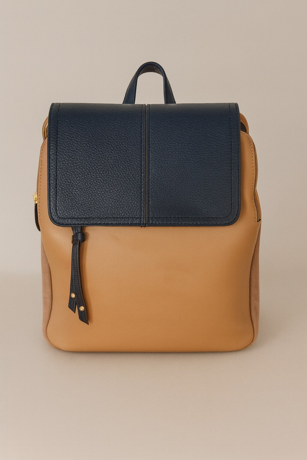 Mochila con textura y cierre de solapa imantado combinada con piel y efecto ante . Dos compartimentos con cierre de cremallera. Forro y bolsillo interior. Bolsillos exteriores, delantero y trasero. Asa de mano fija. Tirantes traseros fijos y ajustables.