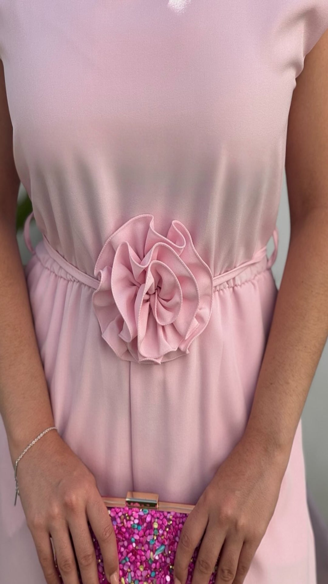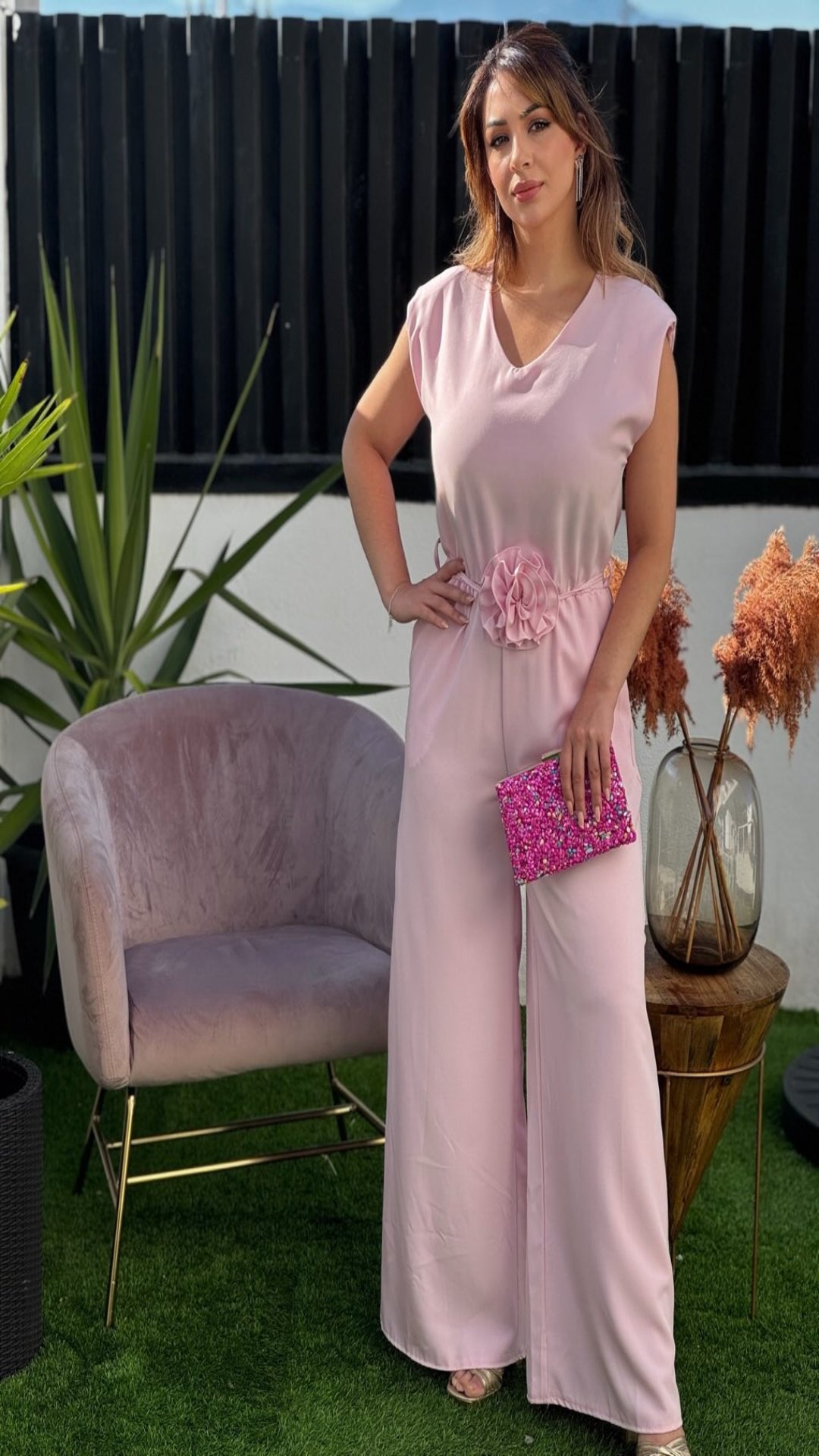 Mono cuello redondo y manga sisa. Detalle de Flor cinturón del mismo tejido. Bolsillos delanteros. Pernera recta. Cierre con botón.