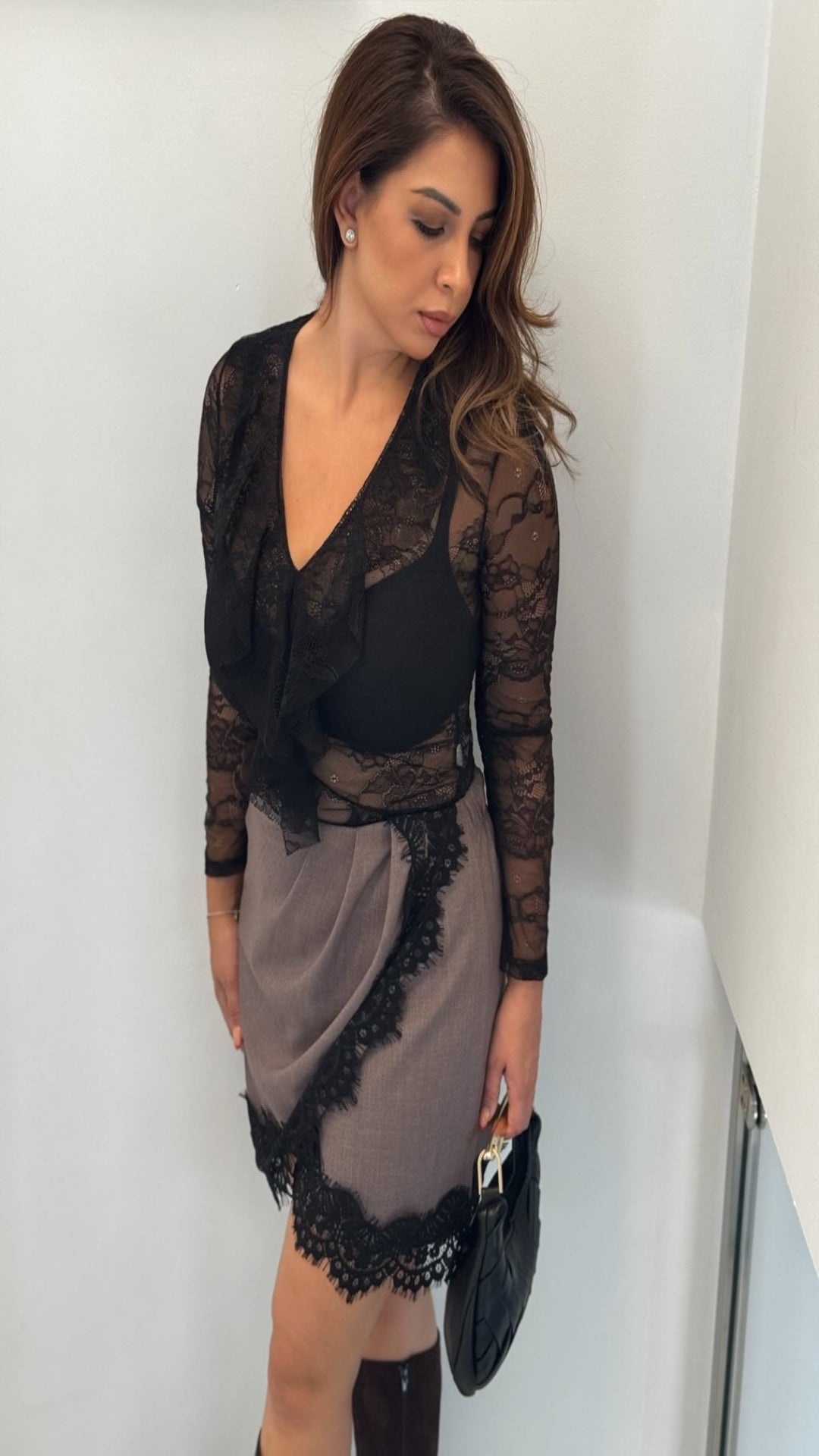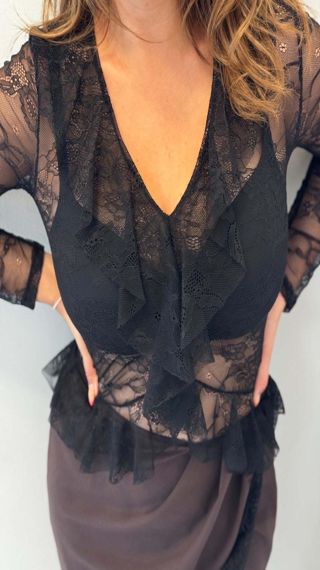 Top confeccionado en tejido tipo encaje transparente . Cuello V y manga larga. Detalle de volantes en mismo tejido.