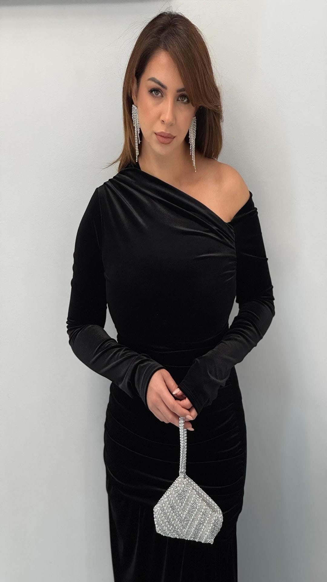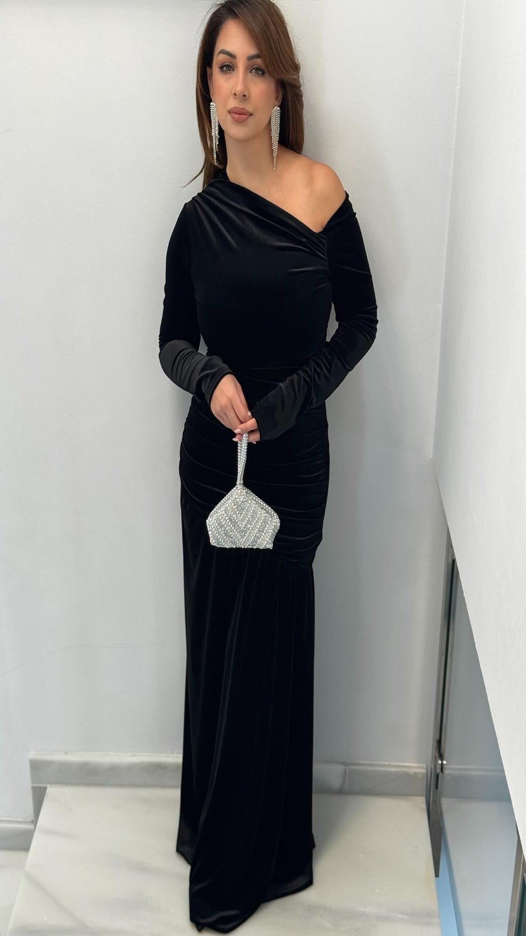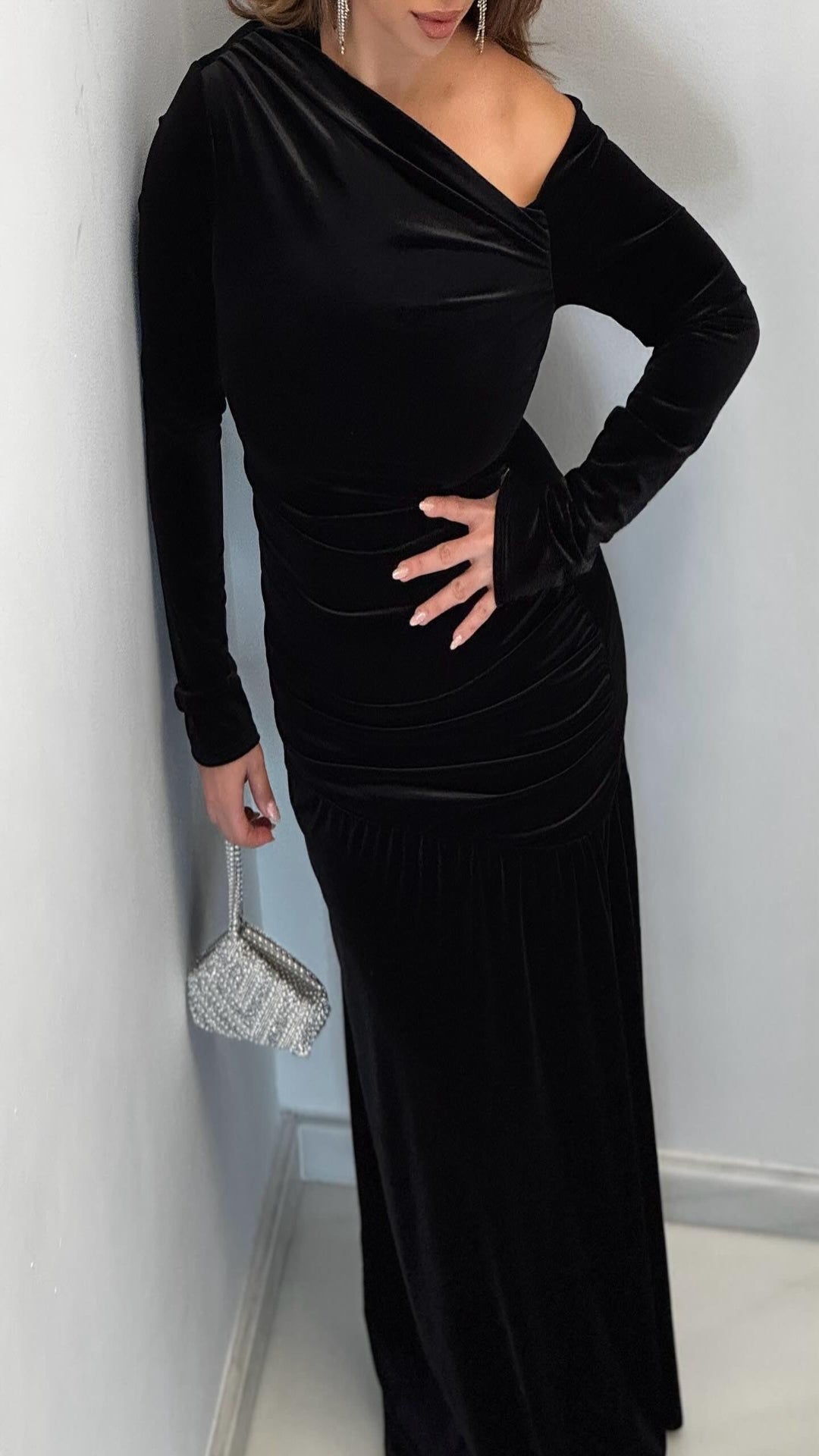 Vestido largo confeccionado en terciopelo. Escote asimétrico y manga larga . Detalle drapeado en la cintura. Bajo fluido.