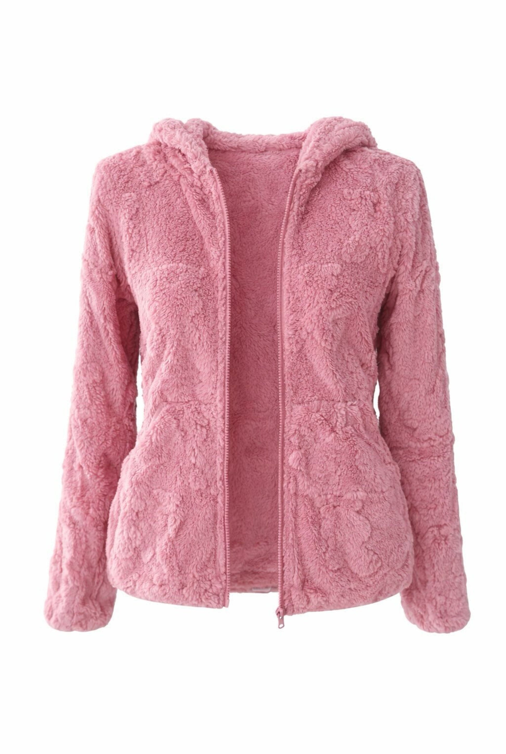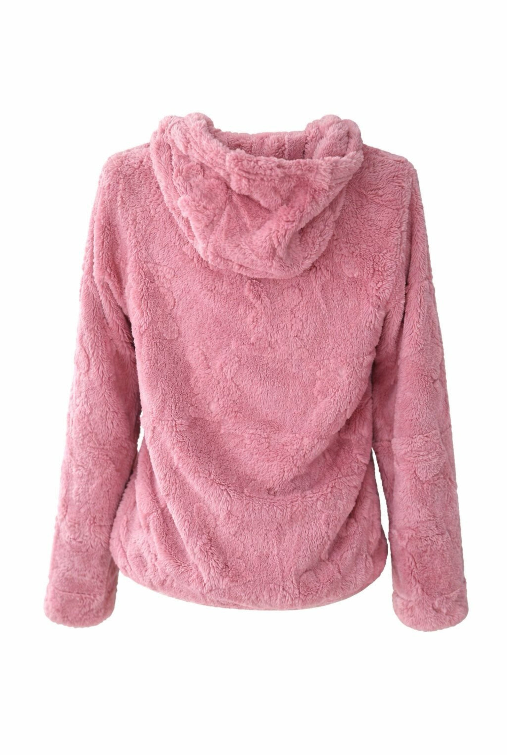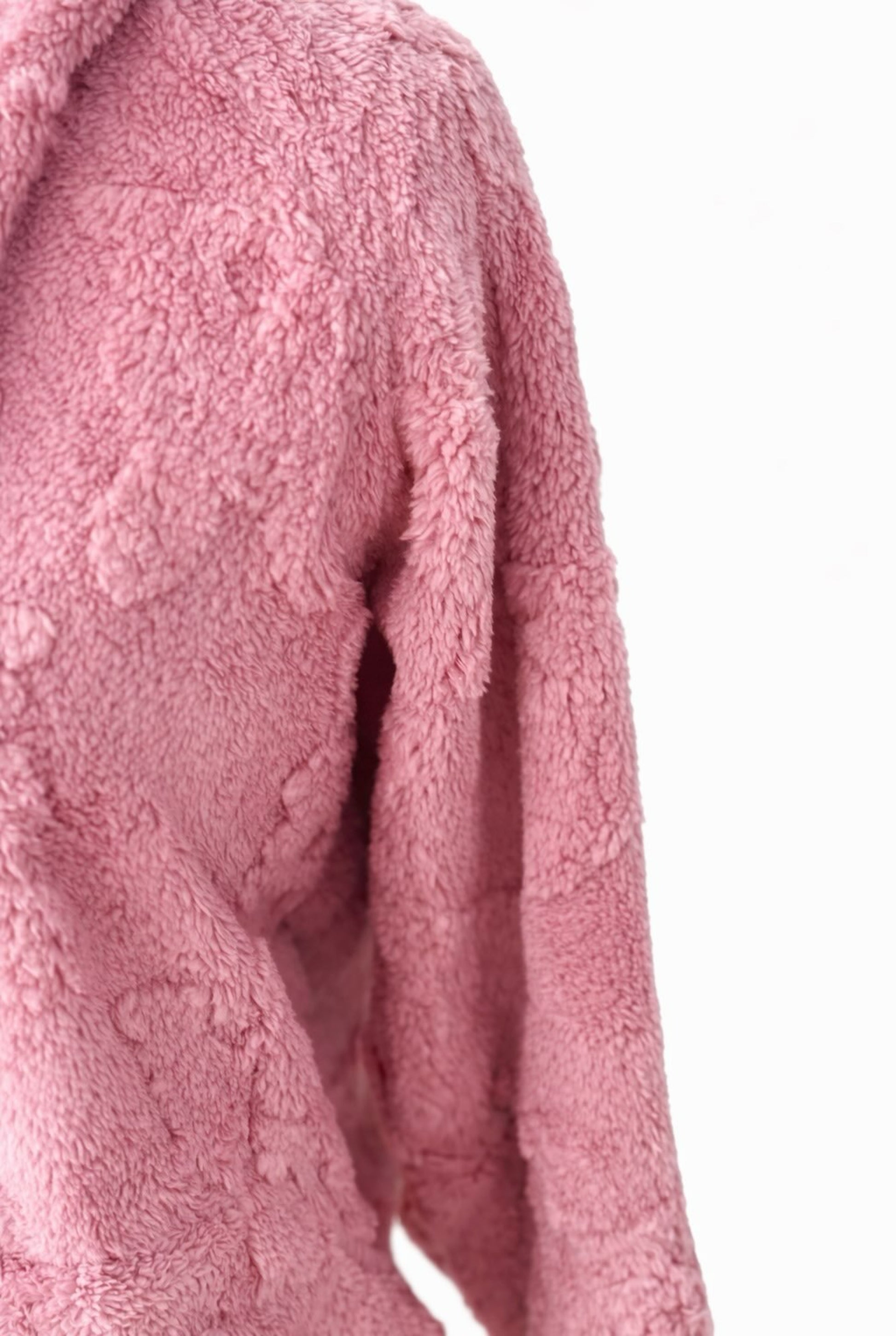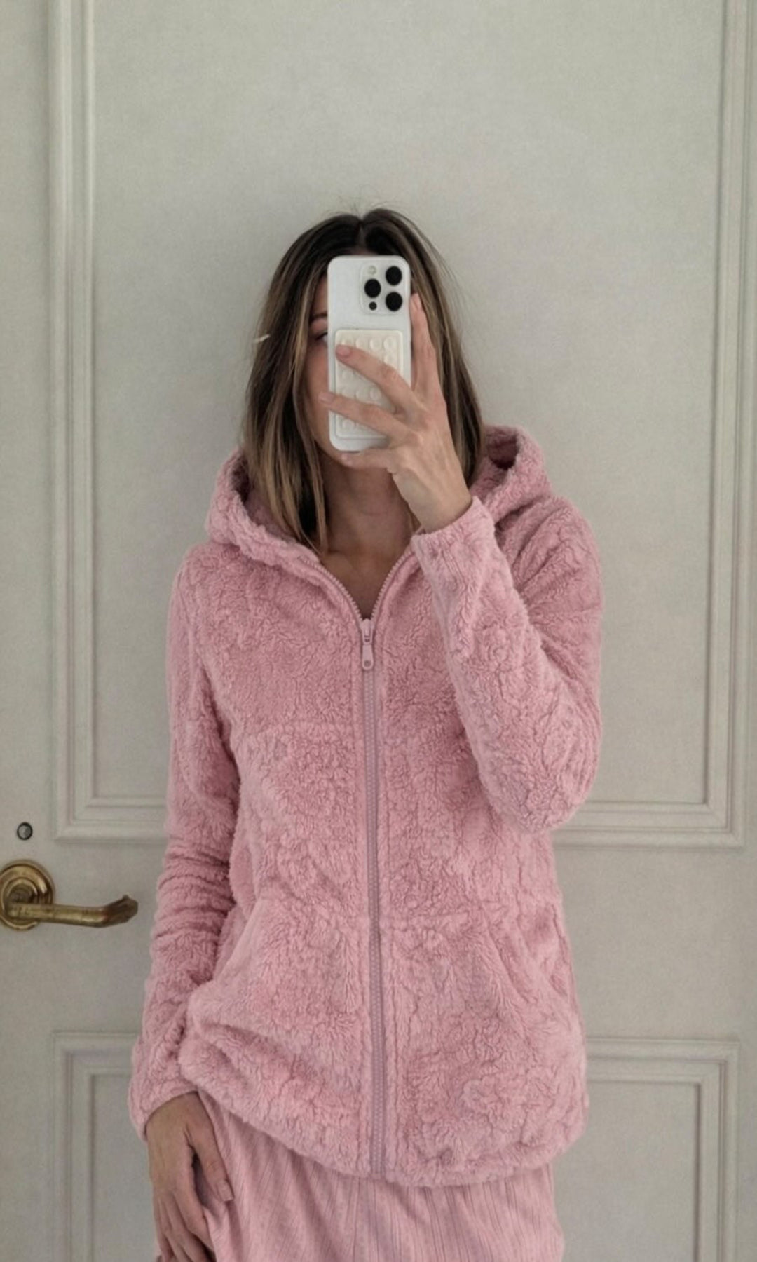 Bata en tejido peluche suave con capucha .Cierre con cremallera ,tiene bolsillos laterales.