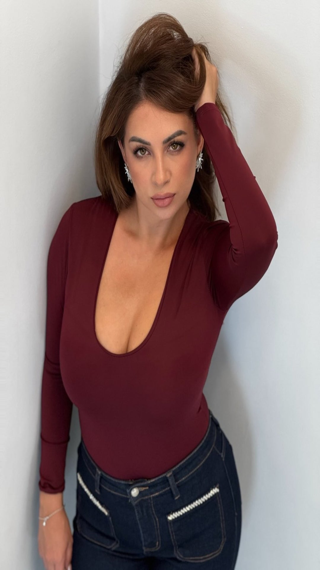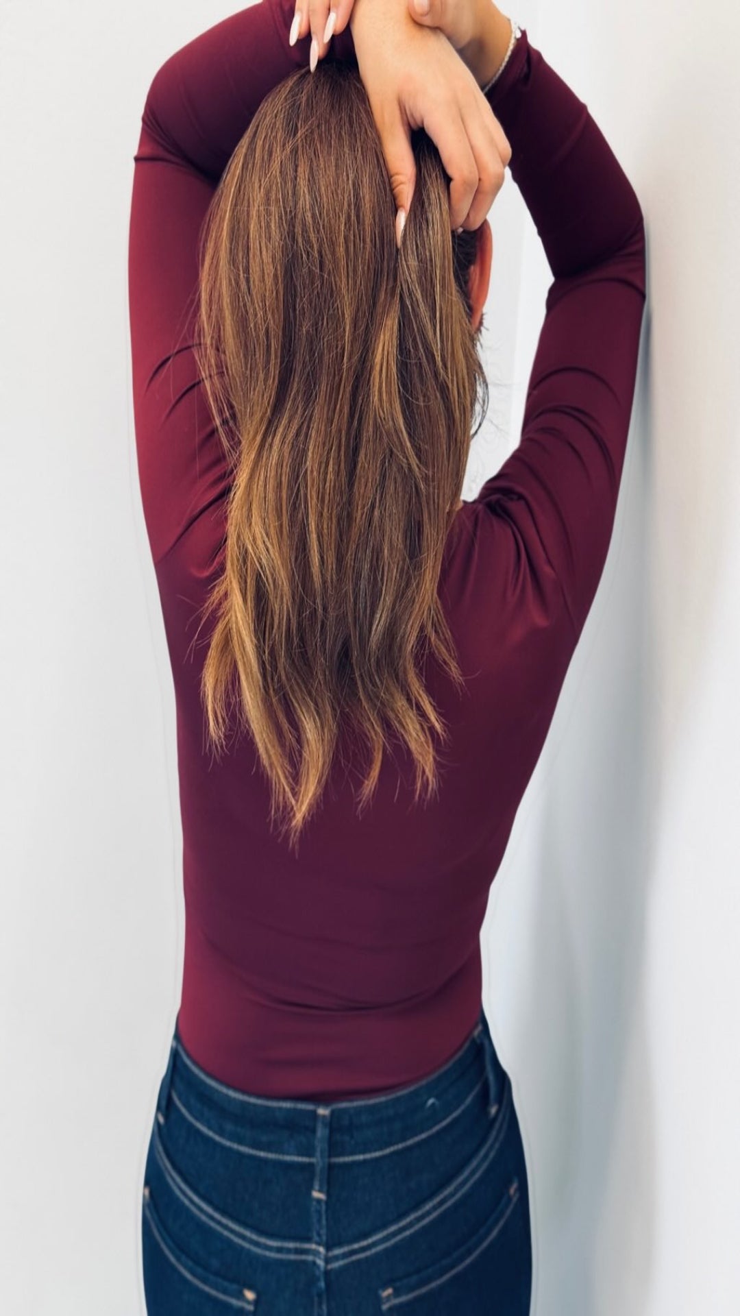 Body lycra de color burdeos entallado de cuello pico y manga larga. Cierre en bajo .