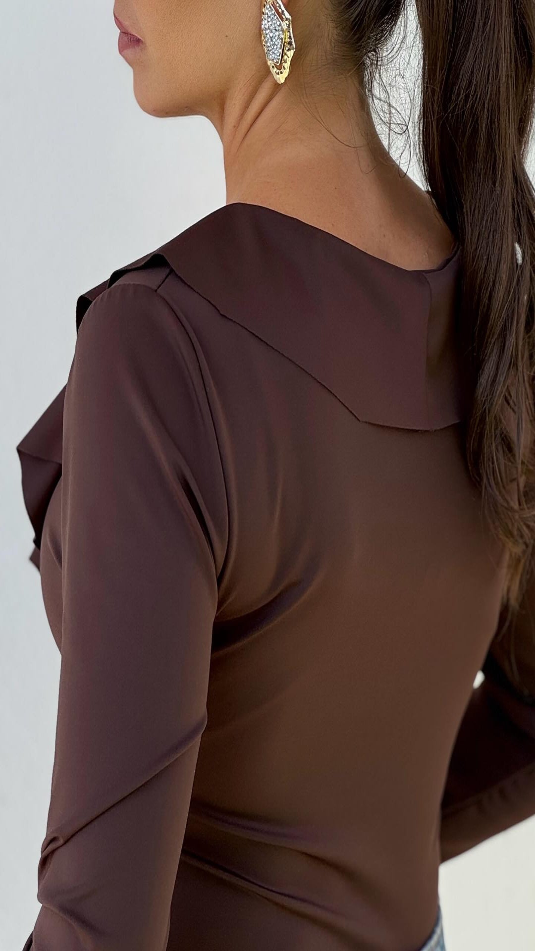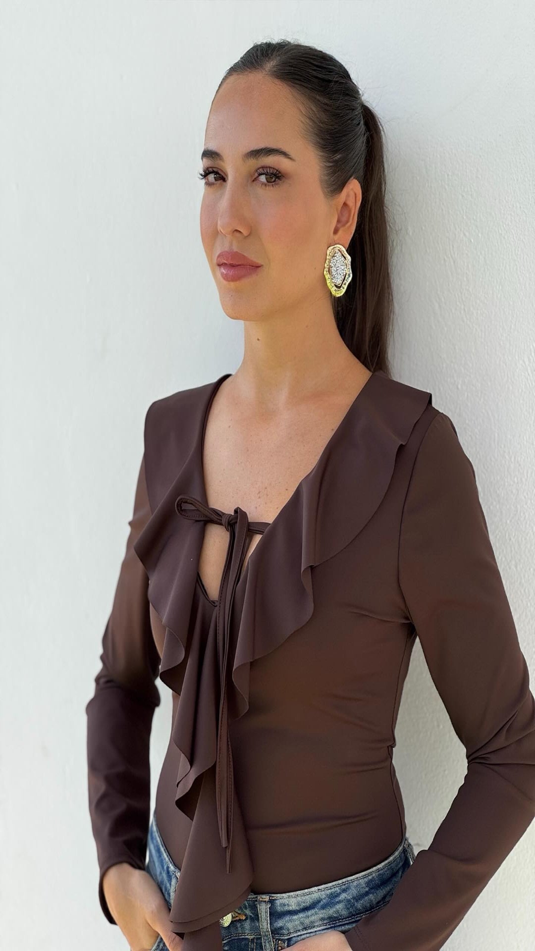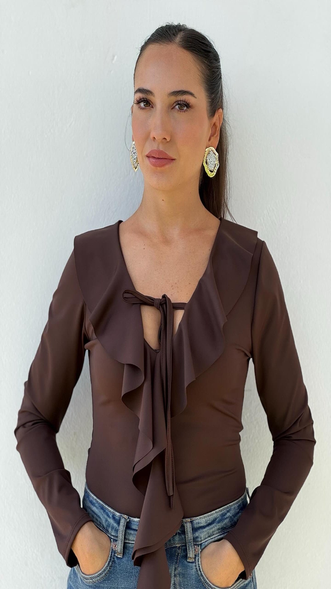 Body entallado de lycra con volantes de escote pico y manga larga. Cierre en bajo con botones a presión.