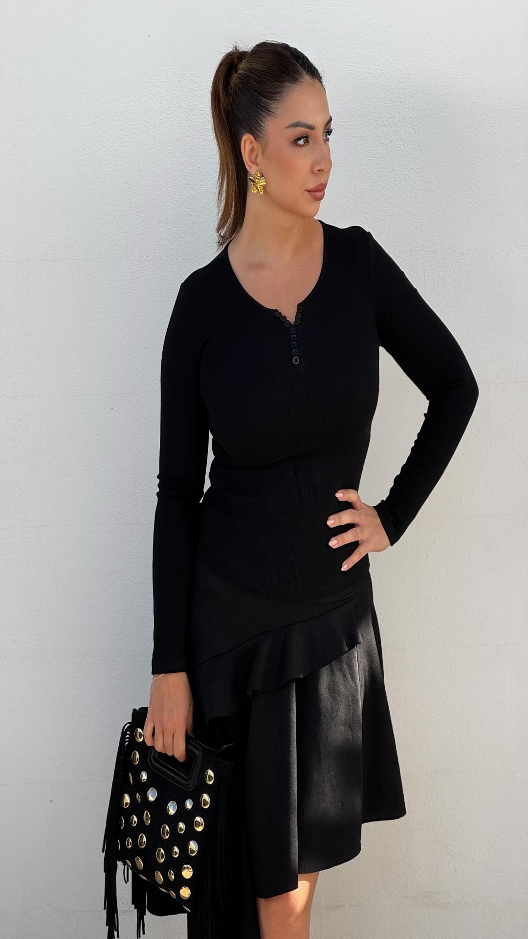 Camiseta de manga larga confeccionada en hilatura con mezcla de algodón. Cuello redondo cierre con botones . Bajo recto.