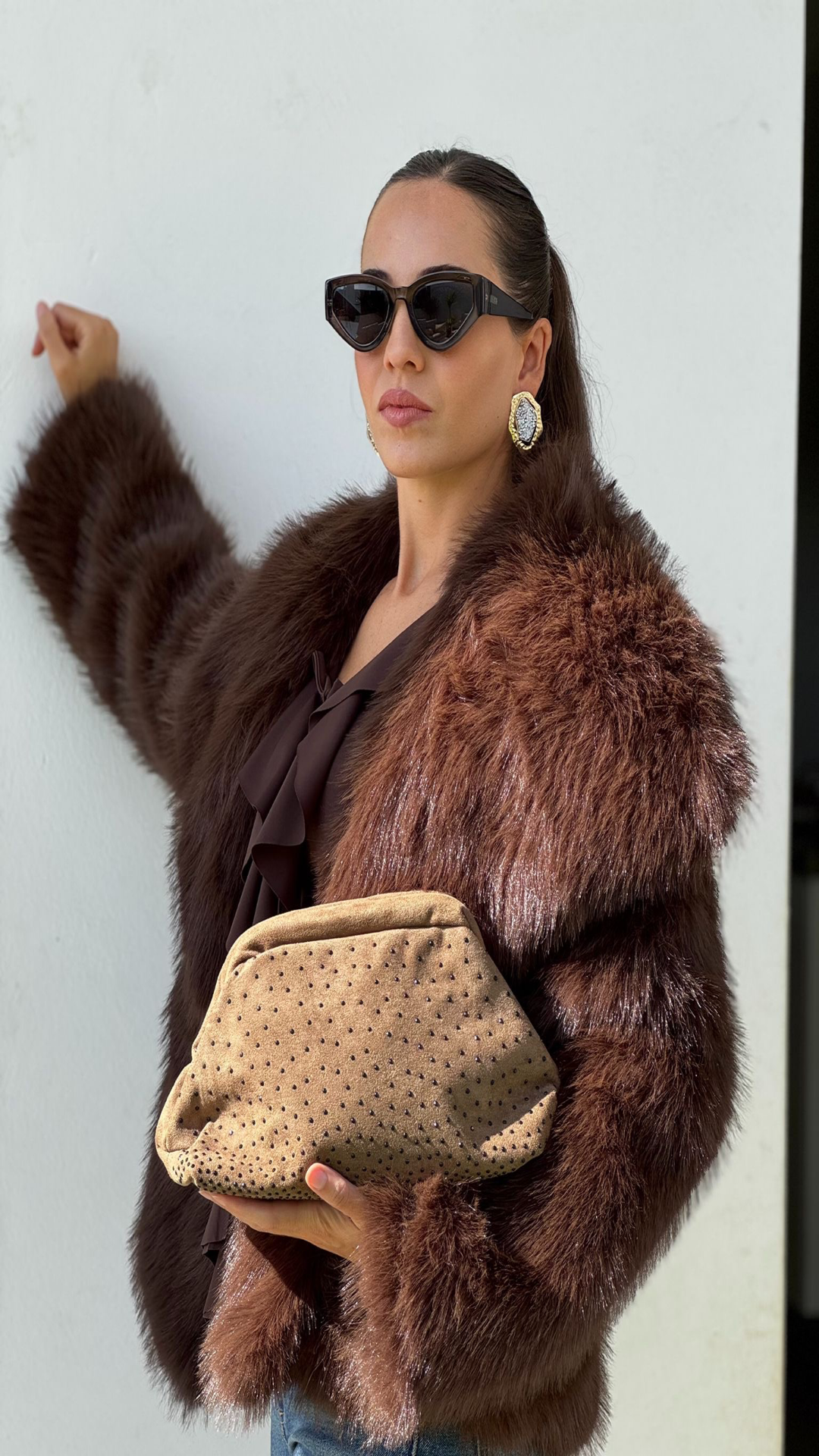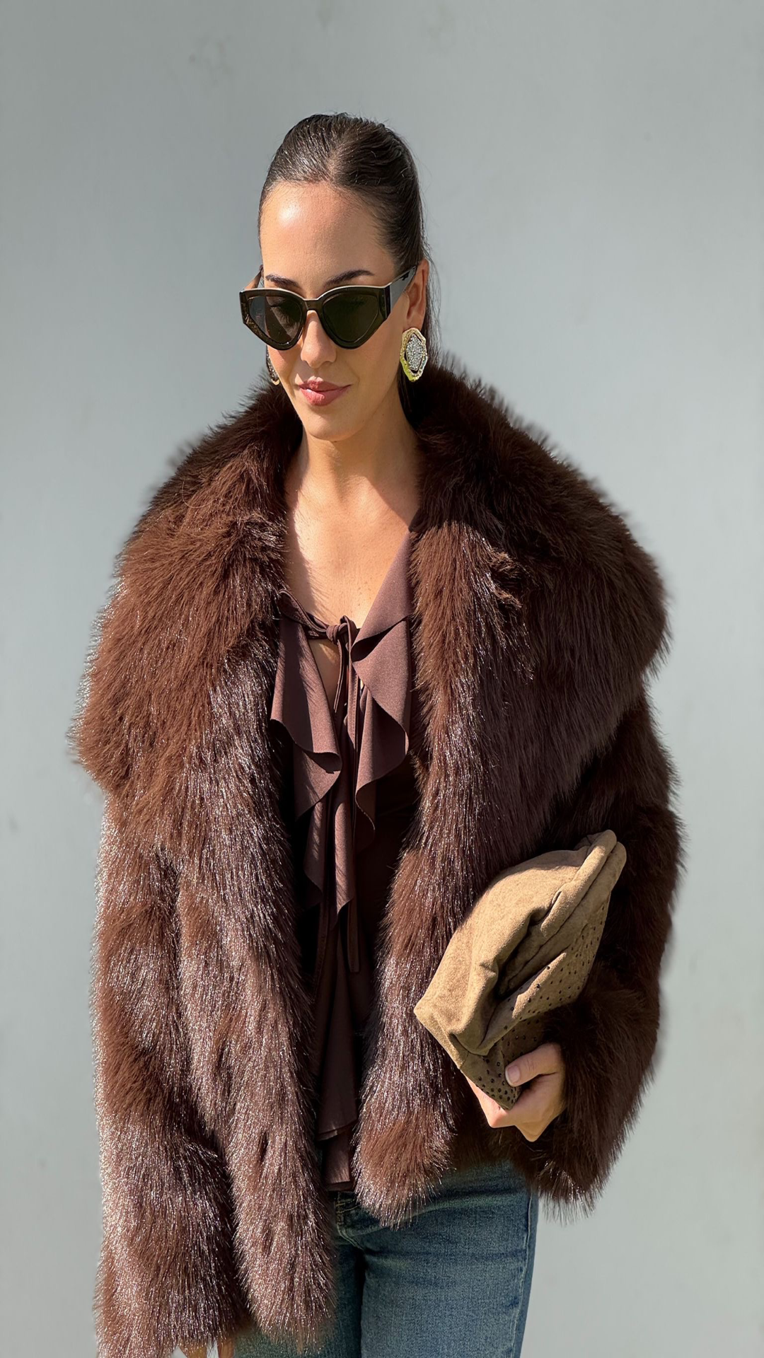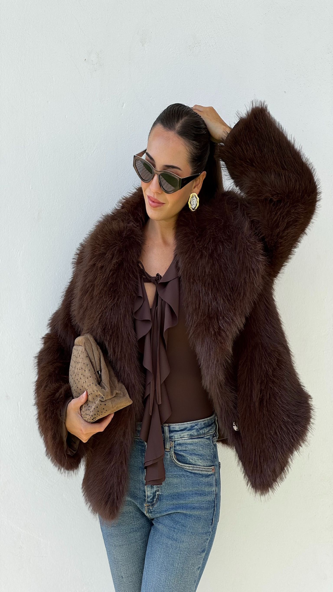 Cazadora corta confeccionada con tejido de efecto pelo. Cuello solapa y manga larga. Bolsillos laterales. Cierre frontal cruzado con botón a presión oculto.