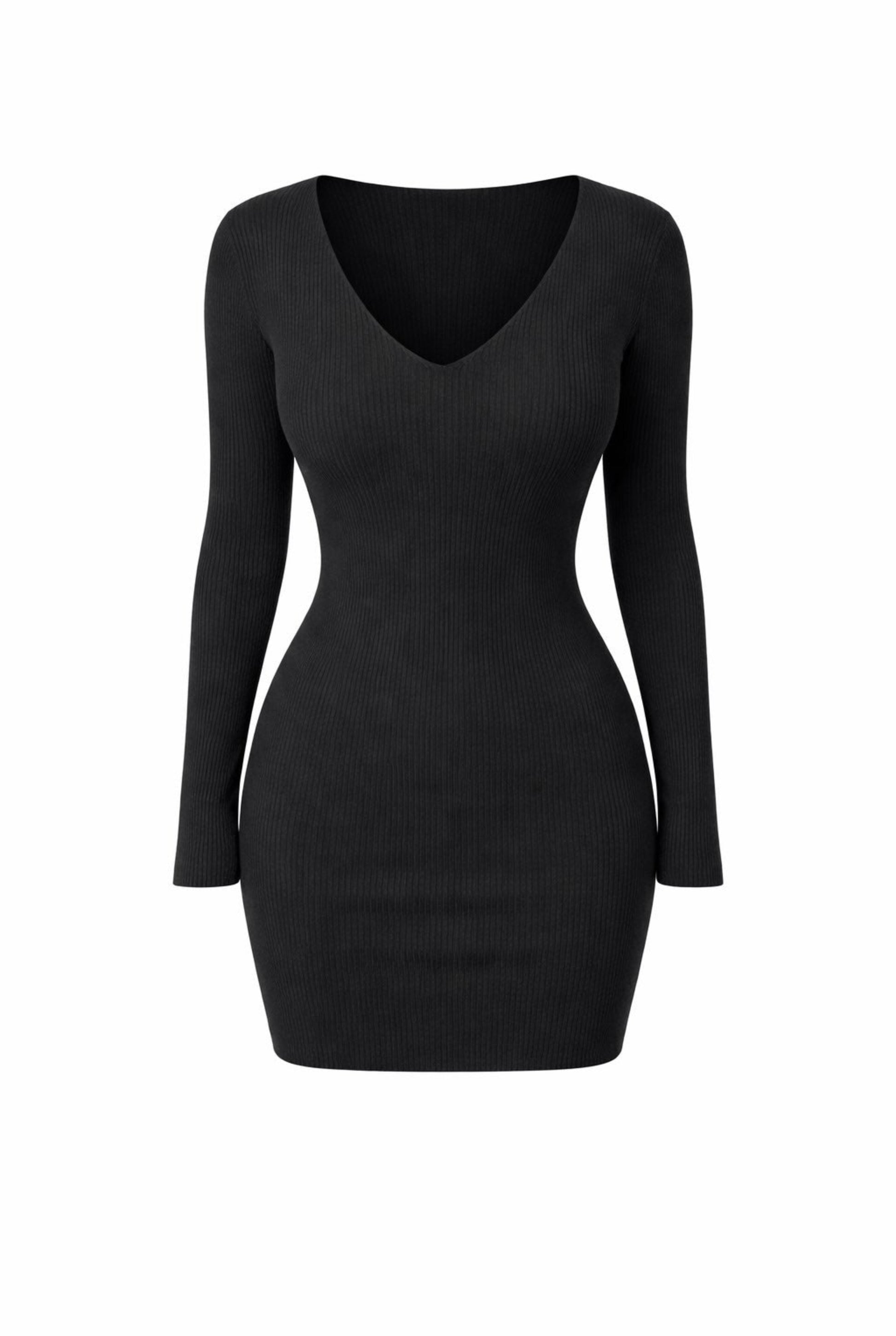 Vestido corto mini de punto canalé. Cuello pico y manga larga.