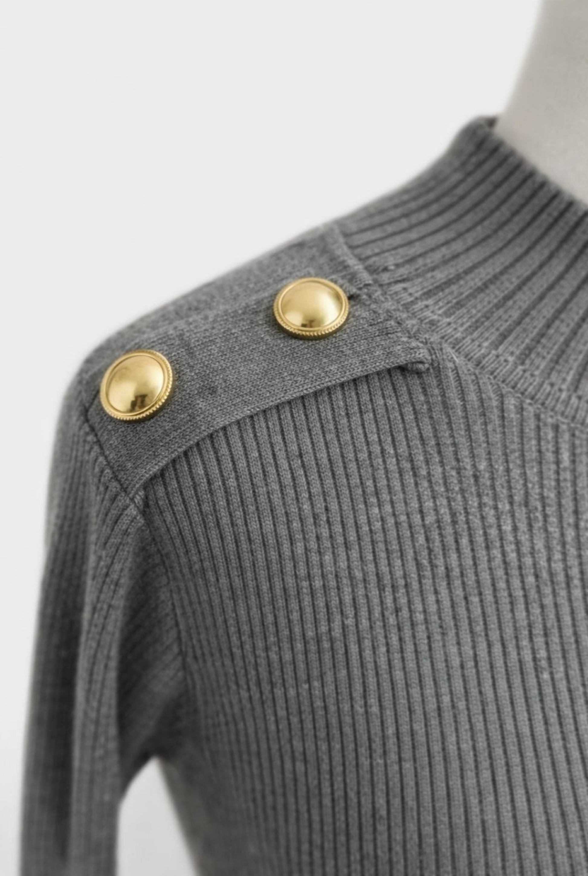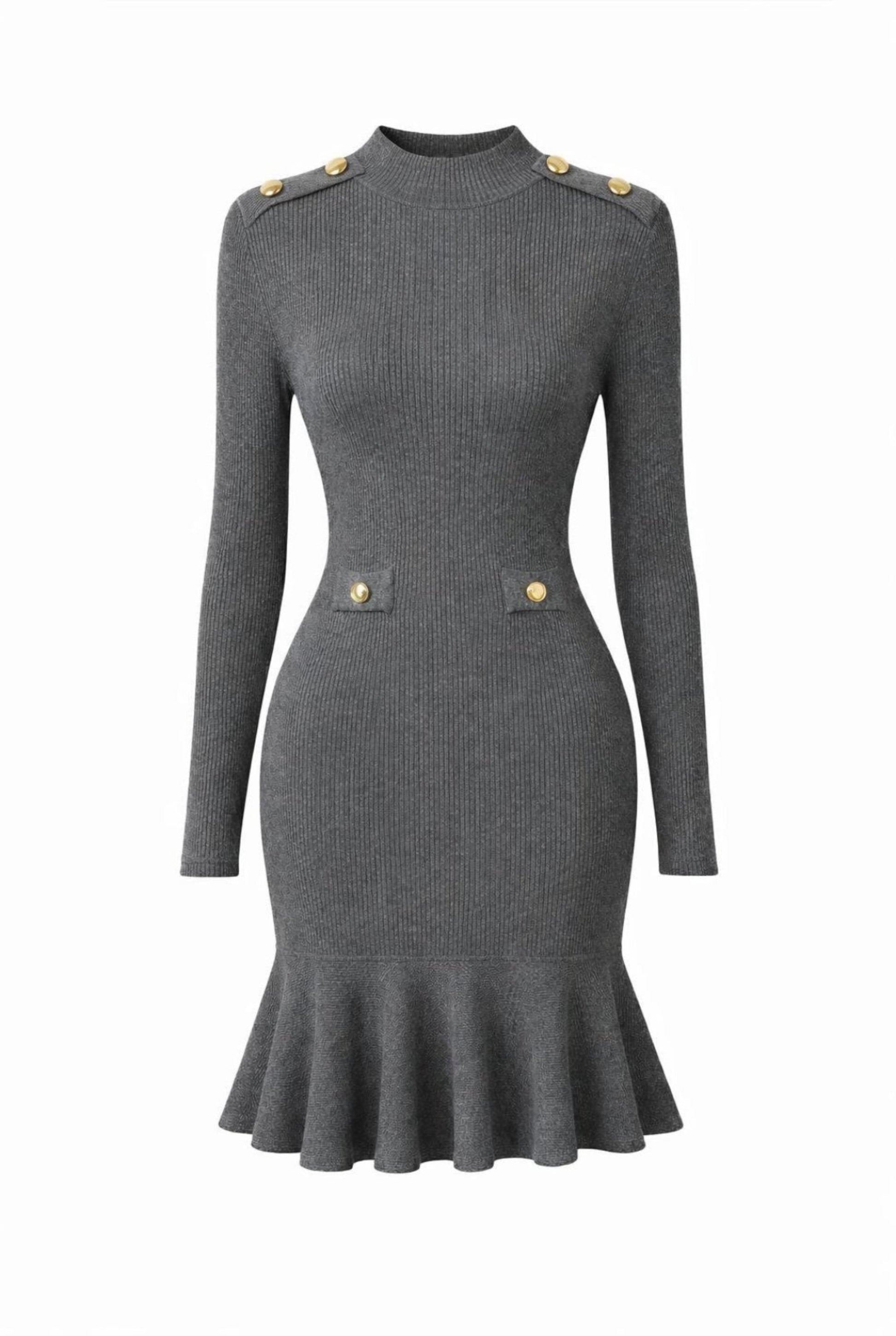 Vestido punto de manga larga con detalles de botones en los hombros y en el frontal del vestido, tiene volantes en la parte inferior.