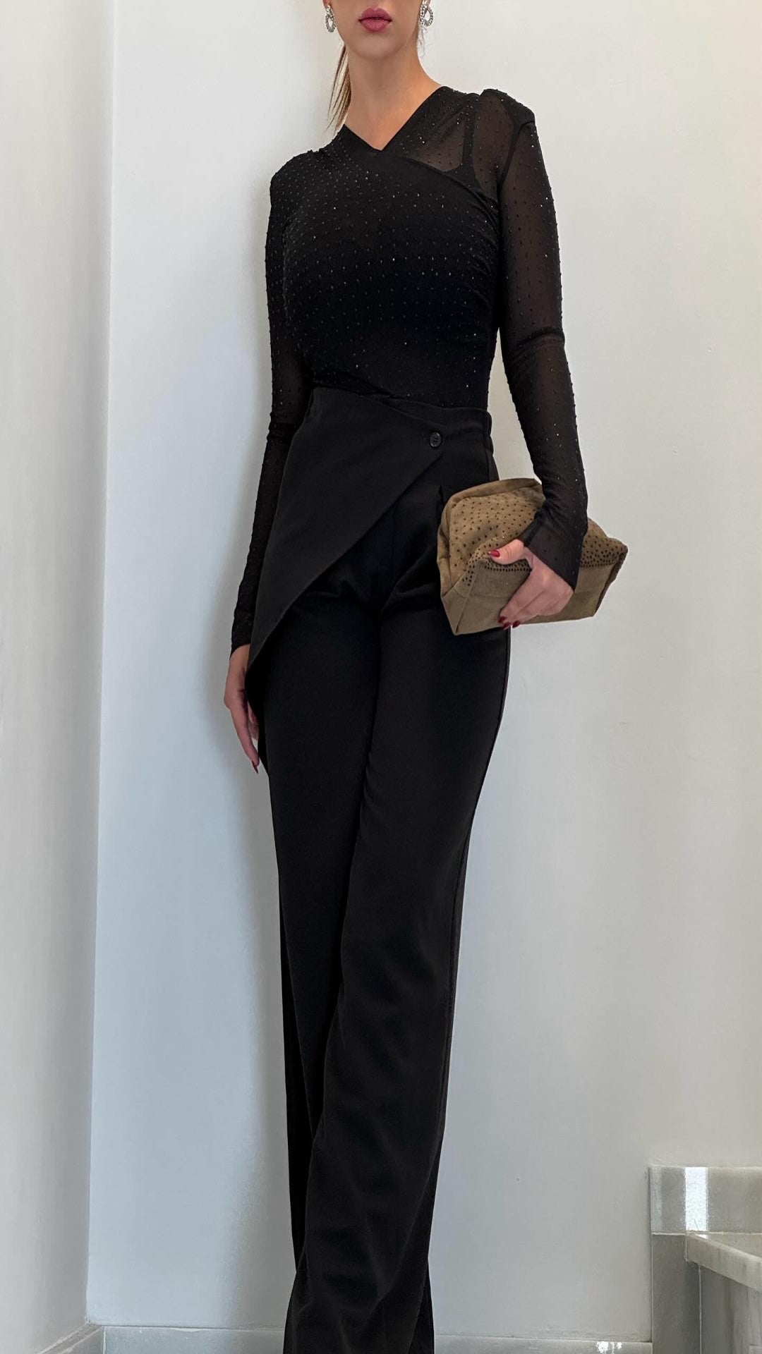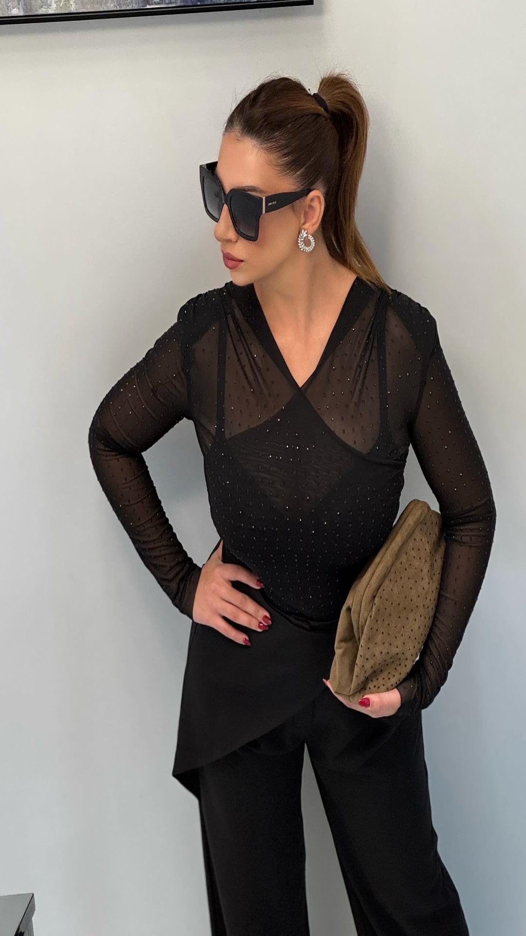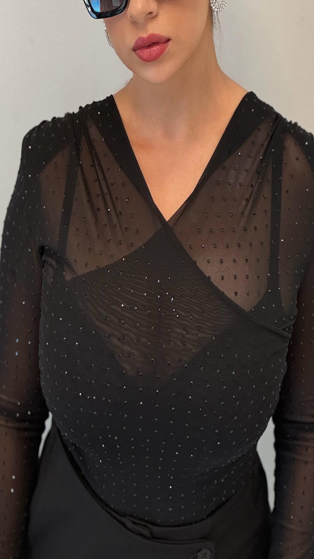 Body semitransparente confeccionado en tejido transparente. Escote pico y mangas largas. Detalle aplicación de brillos combinados a contraste. Cierre en bajo con botones a presión.