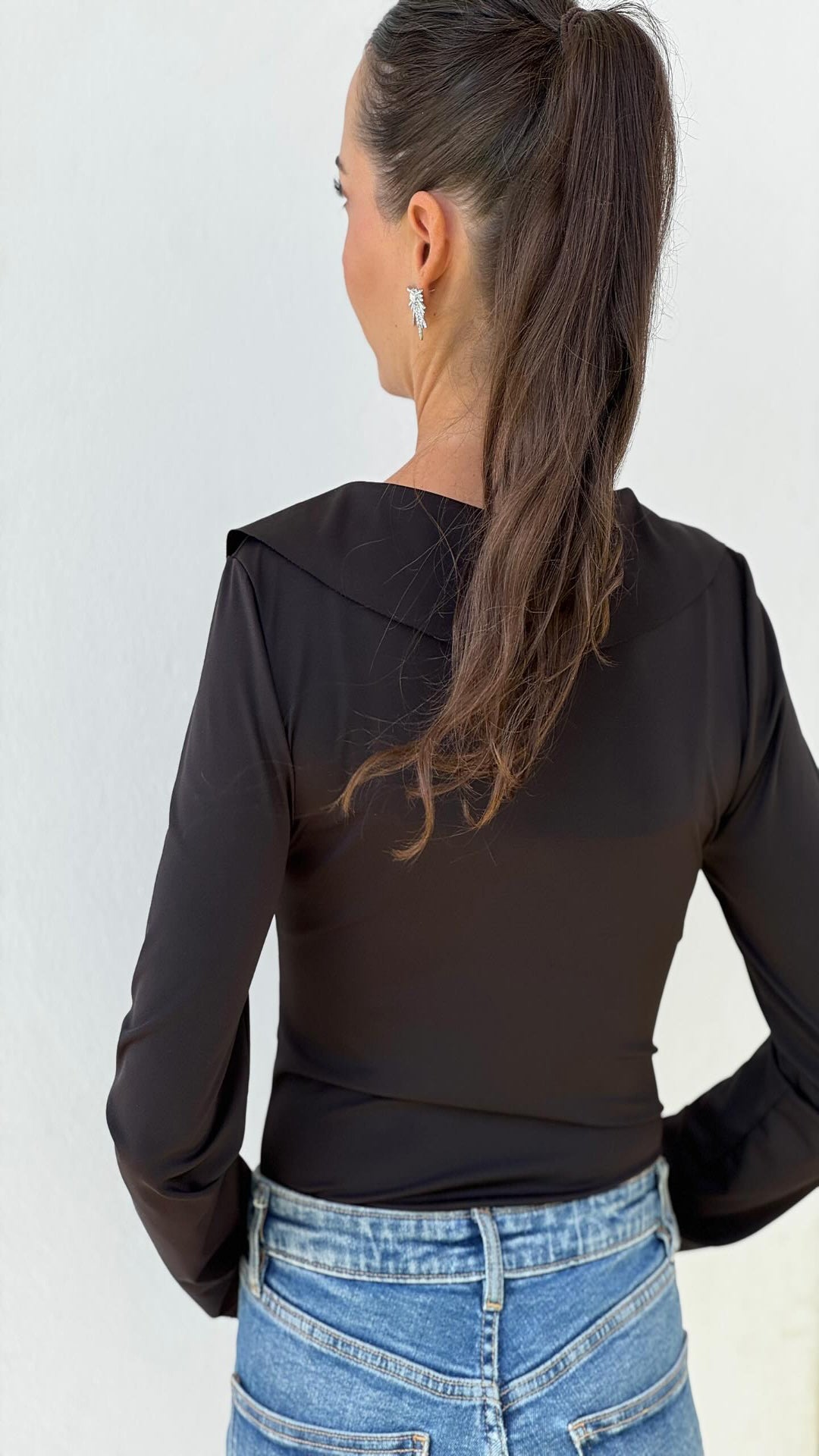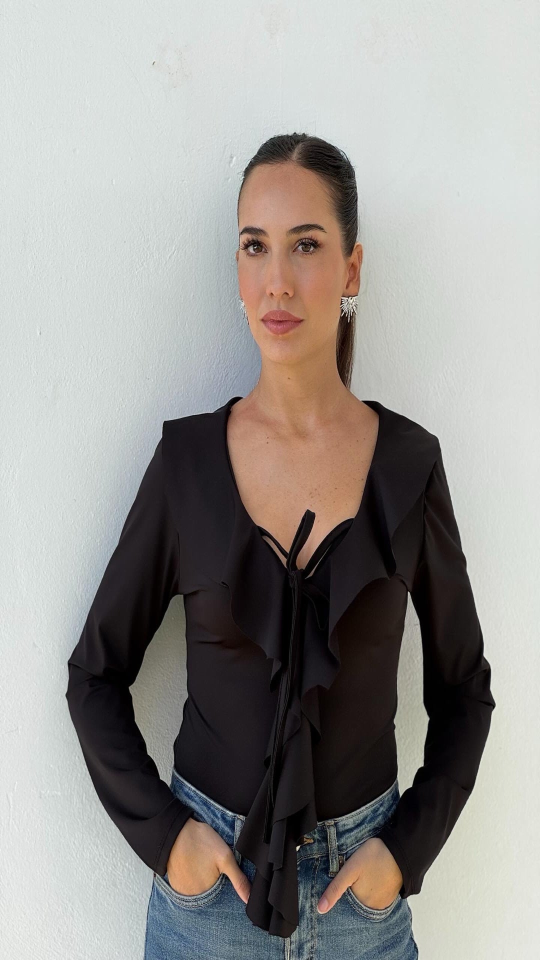 Body entallado de lycra con volantes de escote pico y manga larga. Cierre en bajo con botones a presión.
