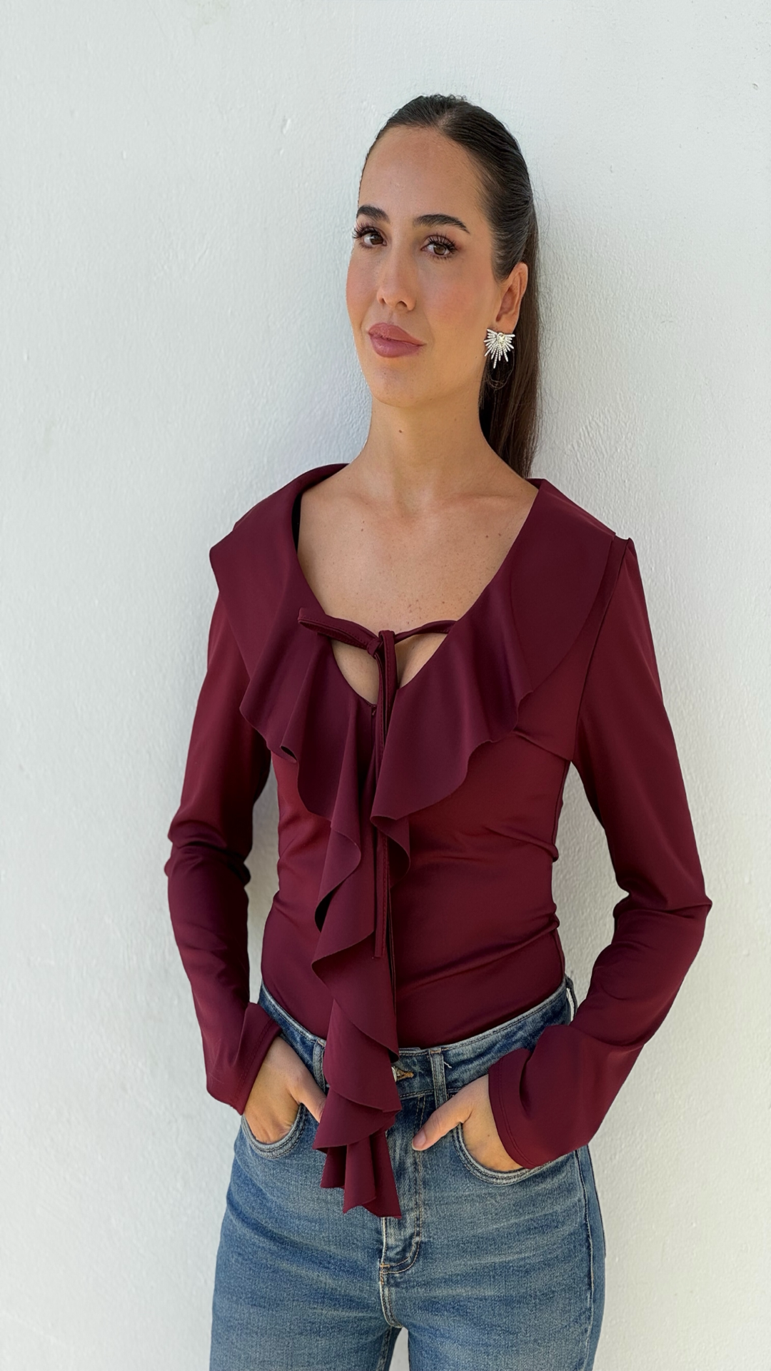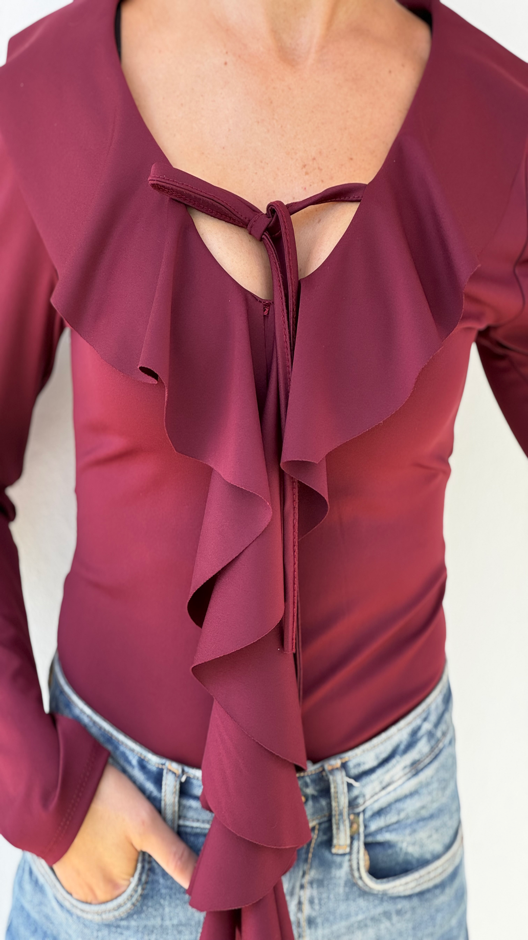Body entallado de lycra  con volantes  de escote pico y manga larga. Cierre en bajo con botones a presión.