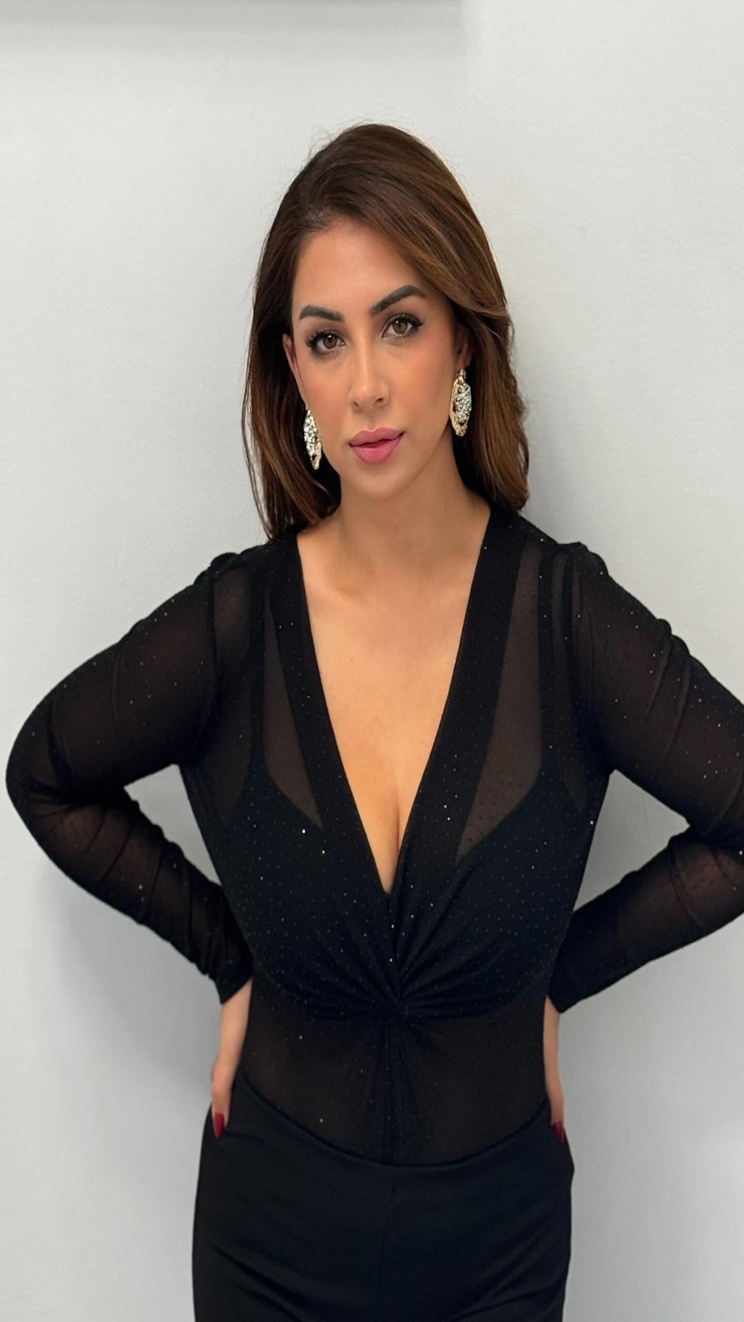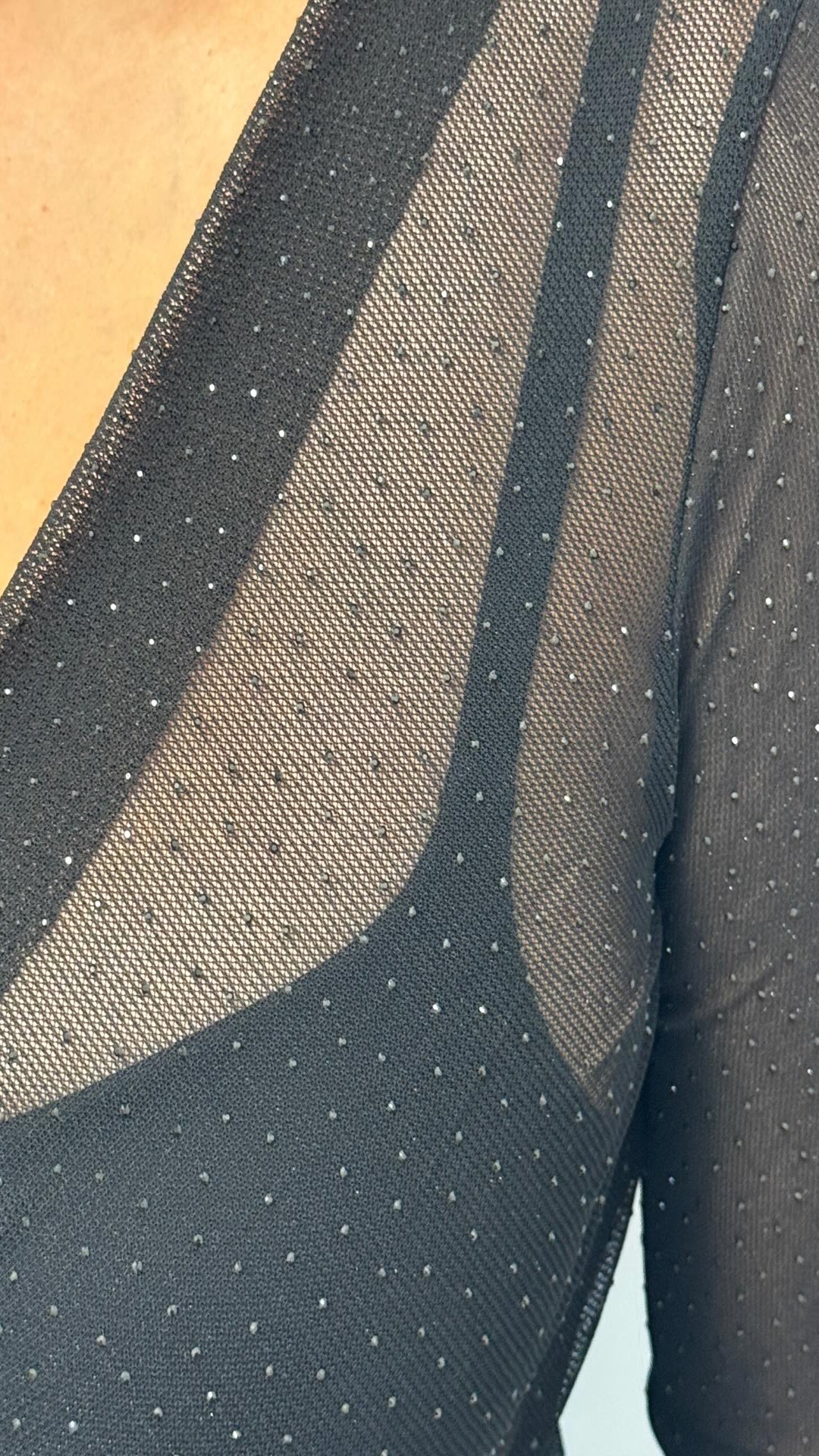 Body semitransparente . Escote pico y mangas largas. Detalle aplicación de brillos combinados a contraste. Cierre en bajo con botones a presión.