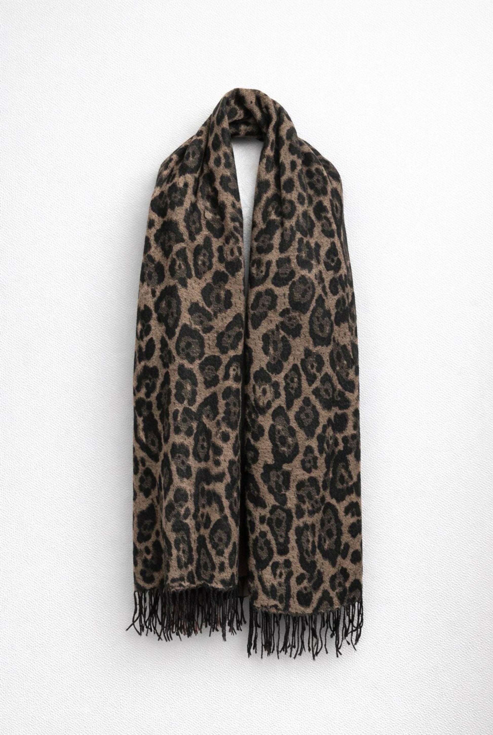 Pañuelo con estampado animal y largos flecos. Hecho en tejido suave.