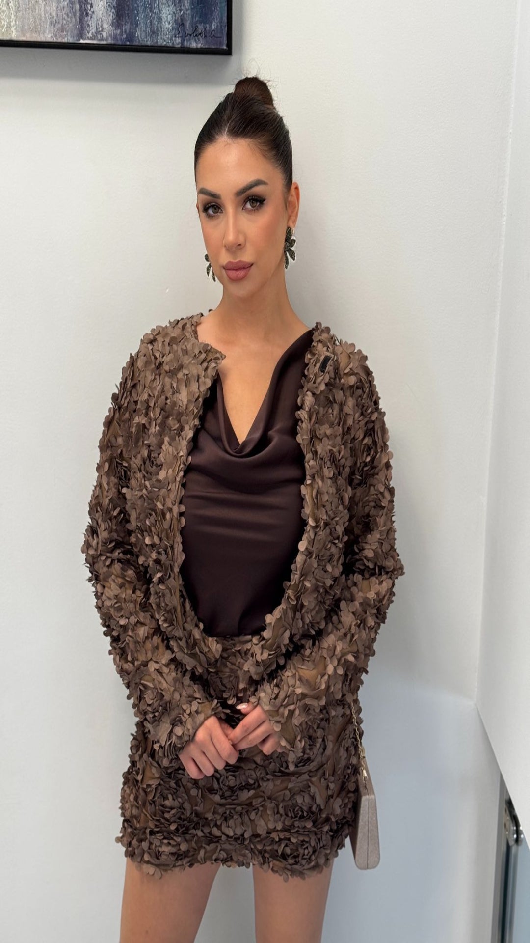 Chaqueta de cuello redondo y manga larga. Diseño de flores en relieve.