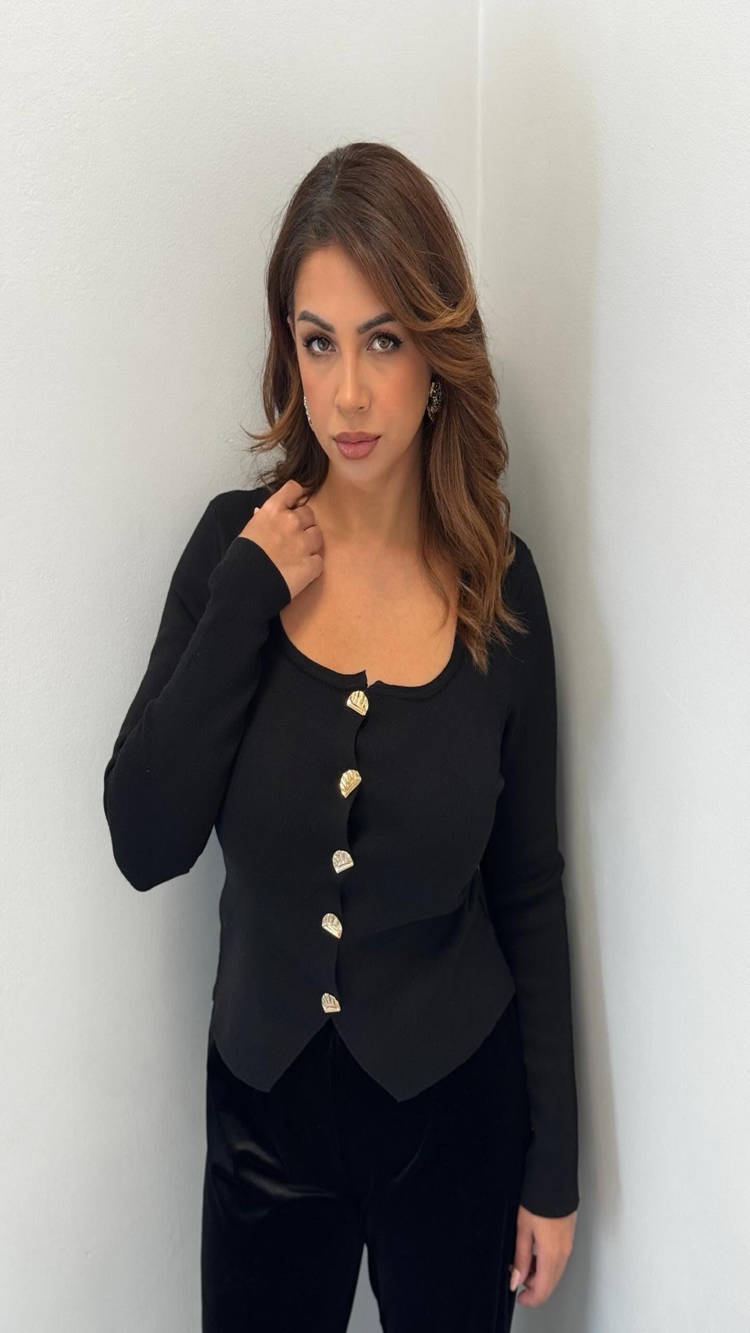 Chaqueta de punto liso con cuello cuadrado y manga larga. Cierre frontal con botones dorados.