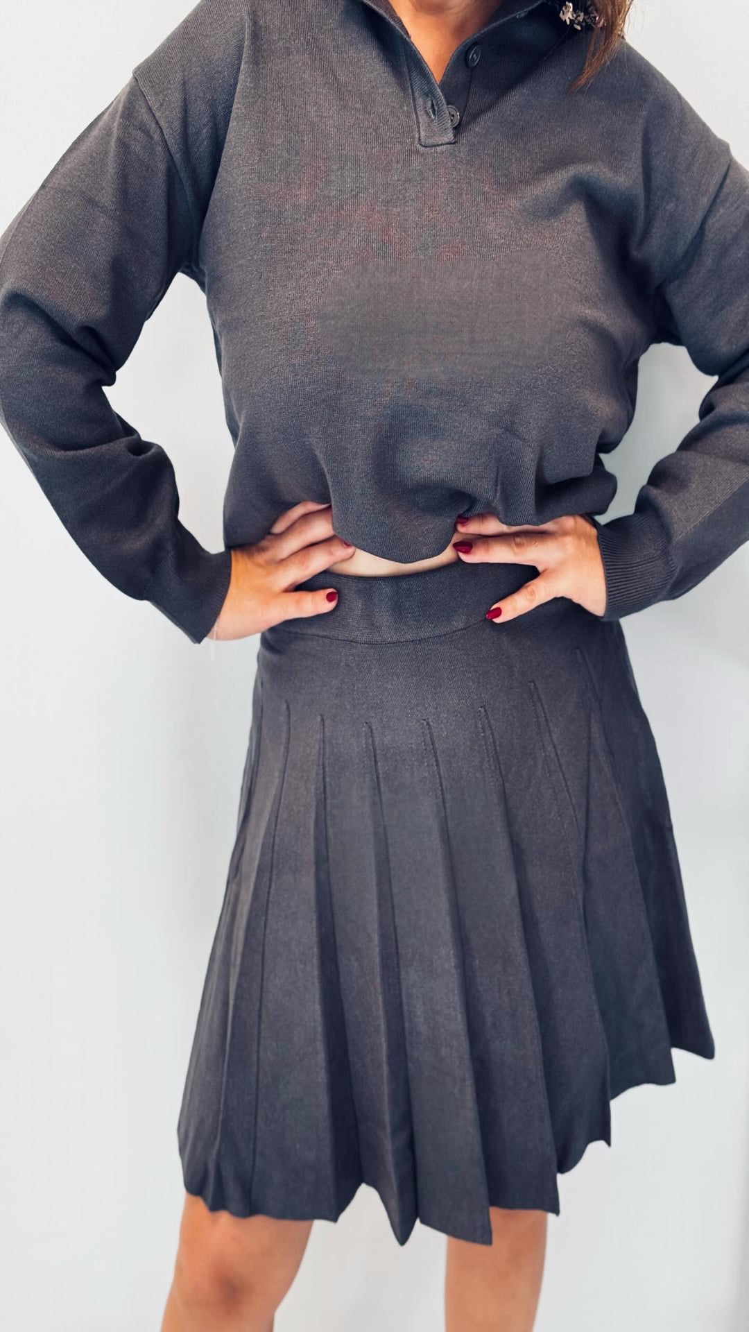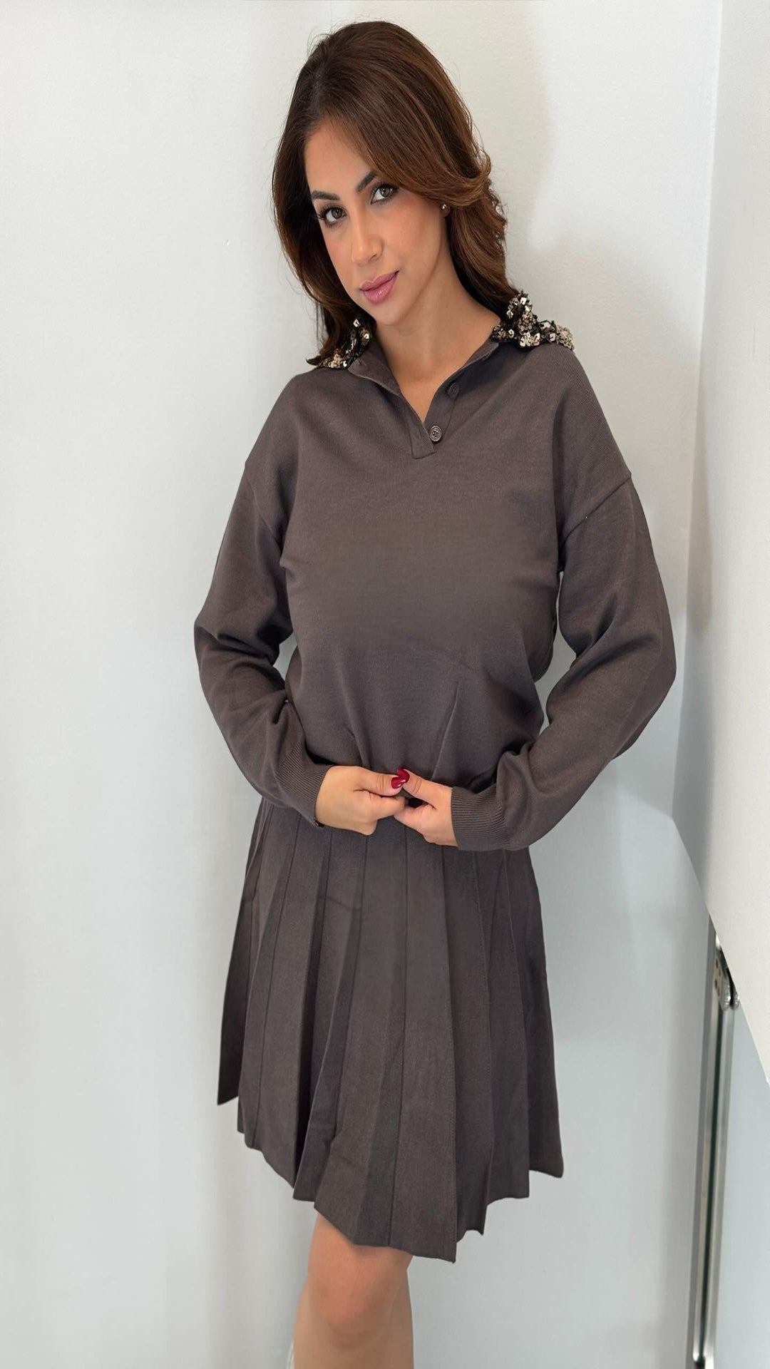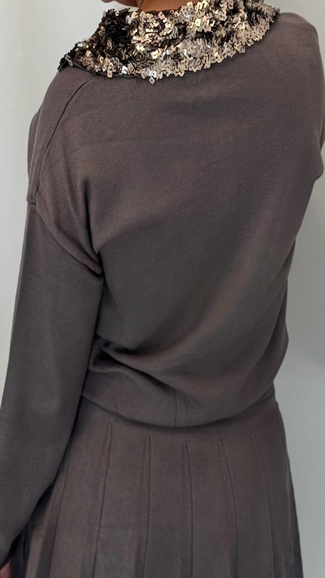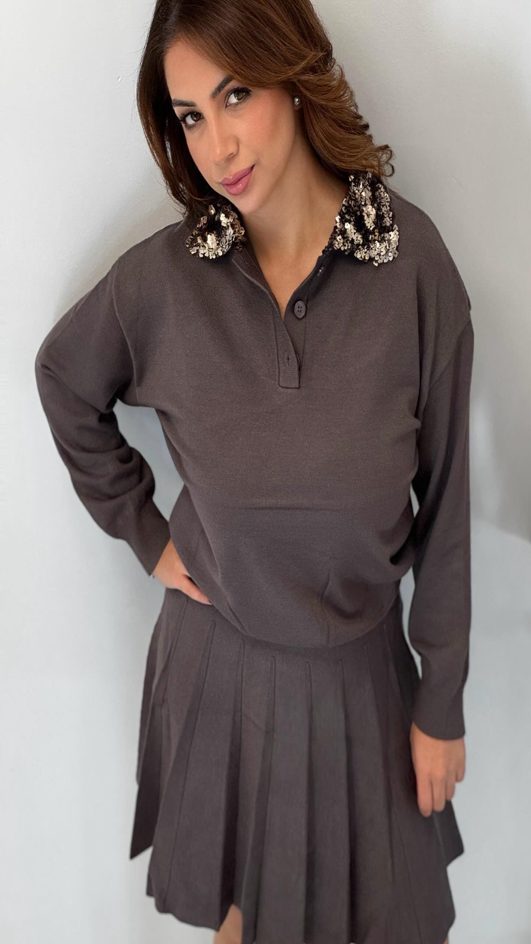 Conjunto de punto jersey y falda .El jersey de cuello polo con manga larga. Cuello solapa de lentejuelas .Botones delanteros. Hombros caídos.