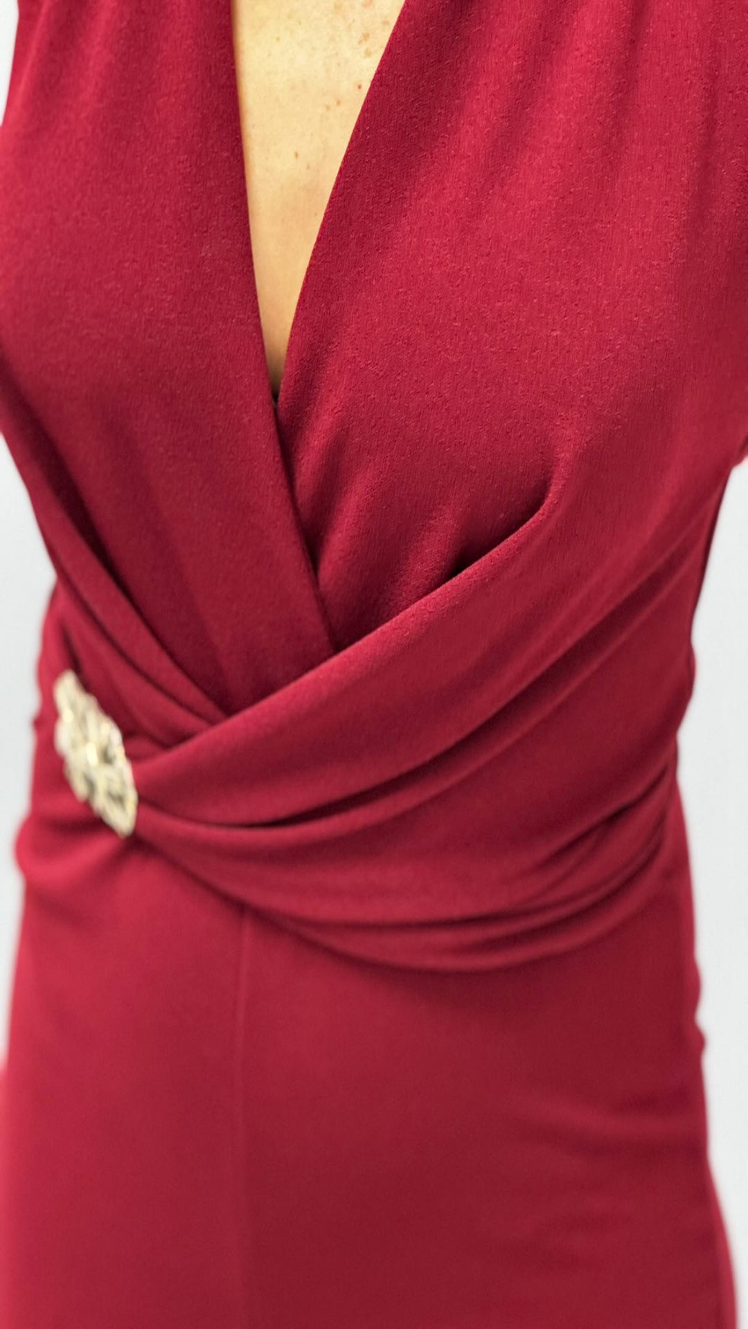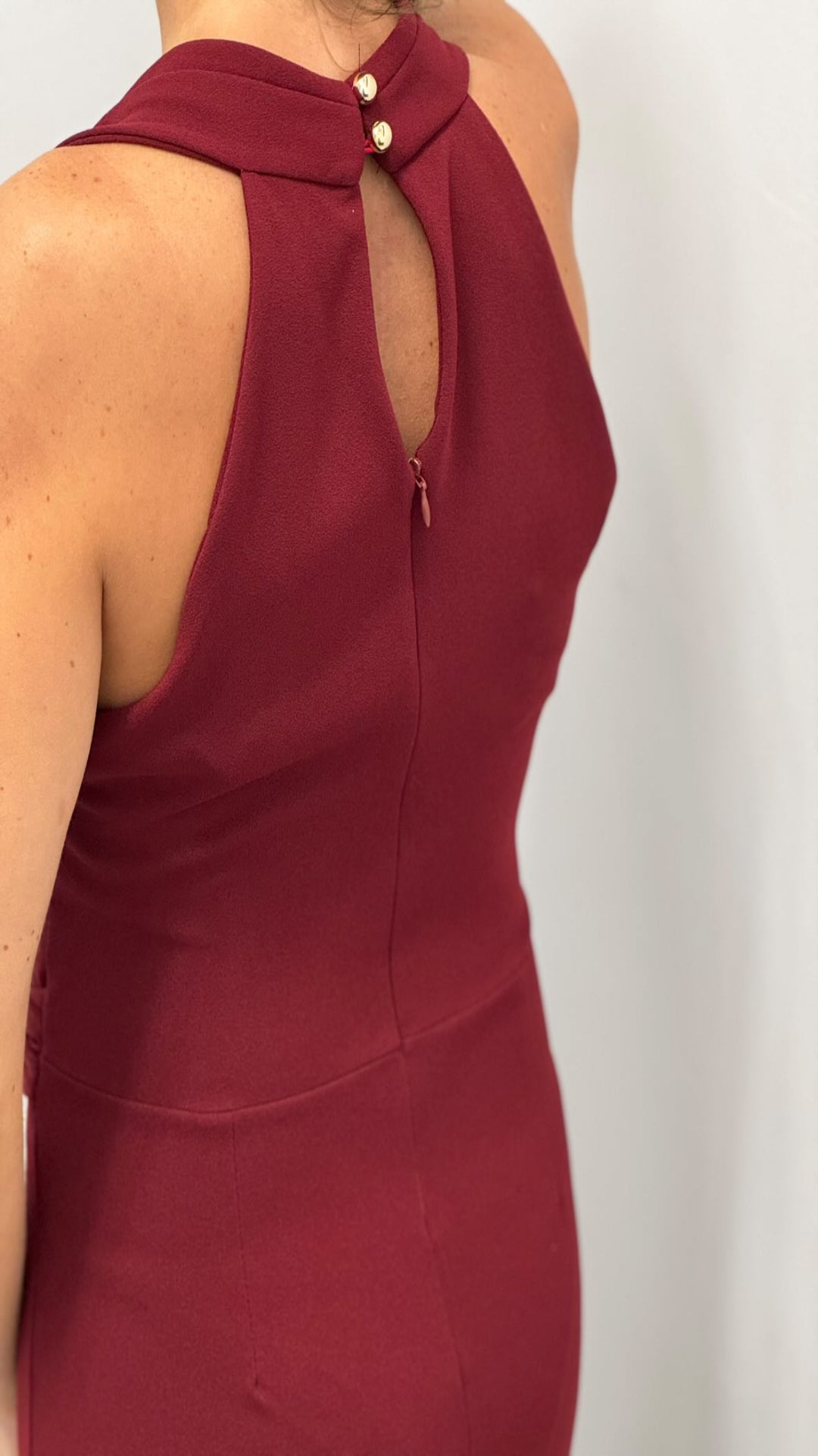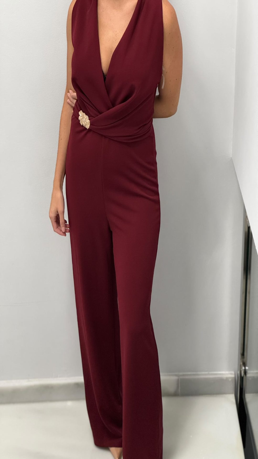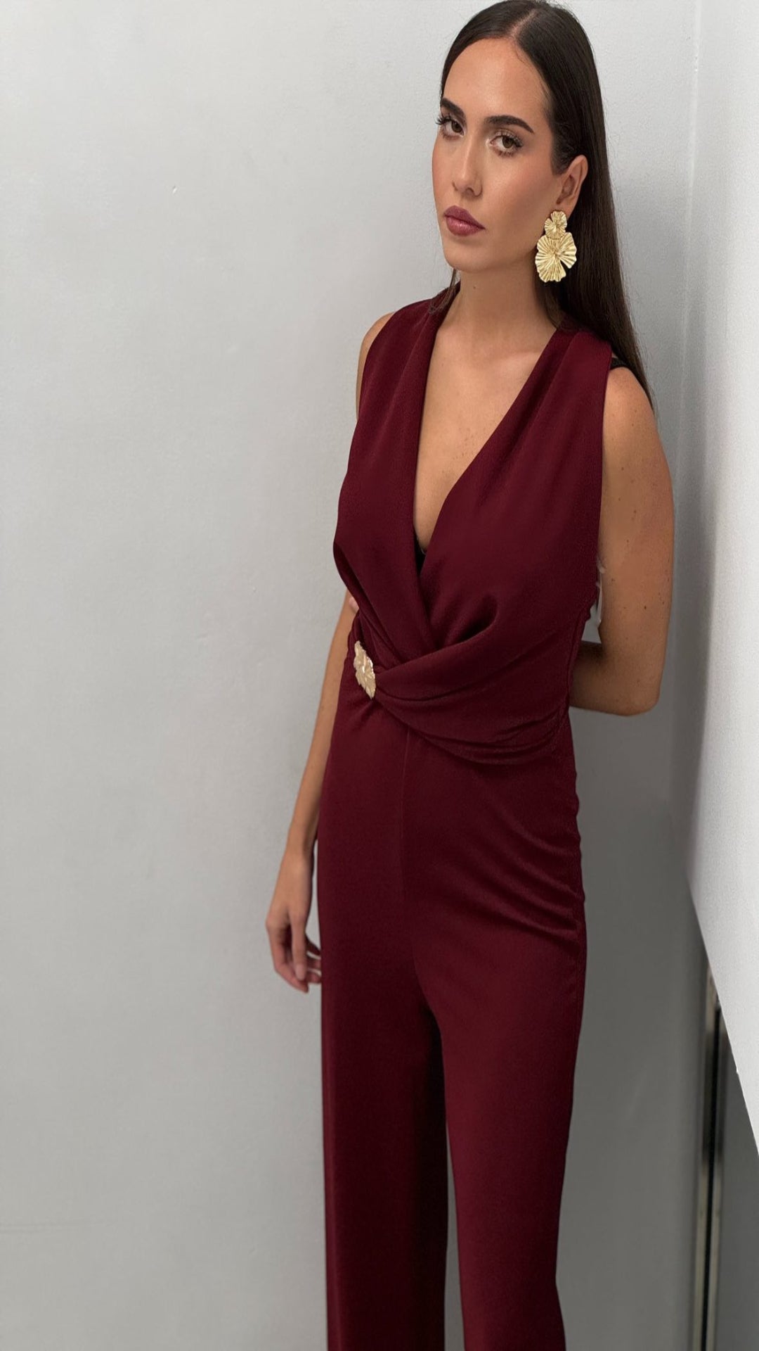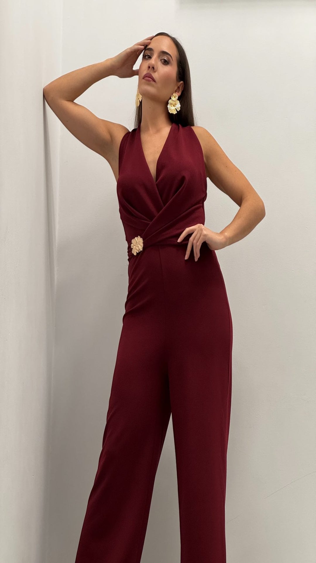 Mono de manga sisa con escote pico. Detalle de cintura cruzada con hebilla dorada. Cierre en espalda con cremallera oculta en costura y botones dorados.