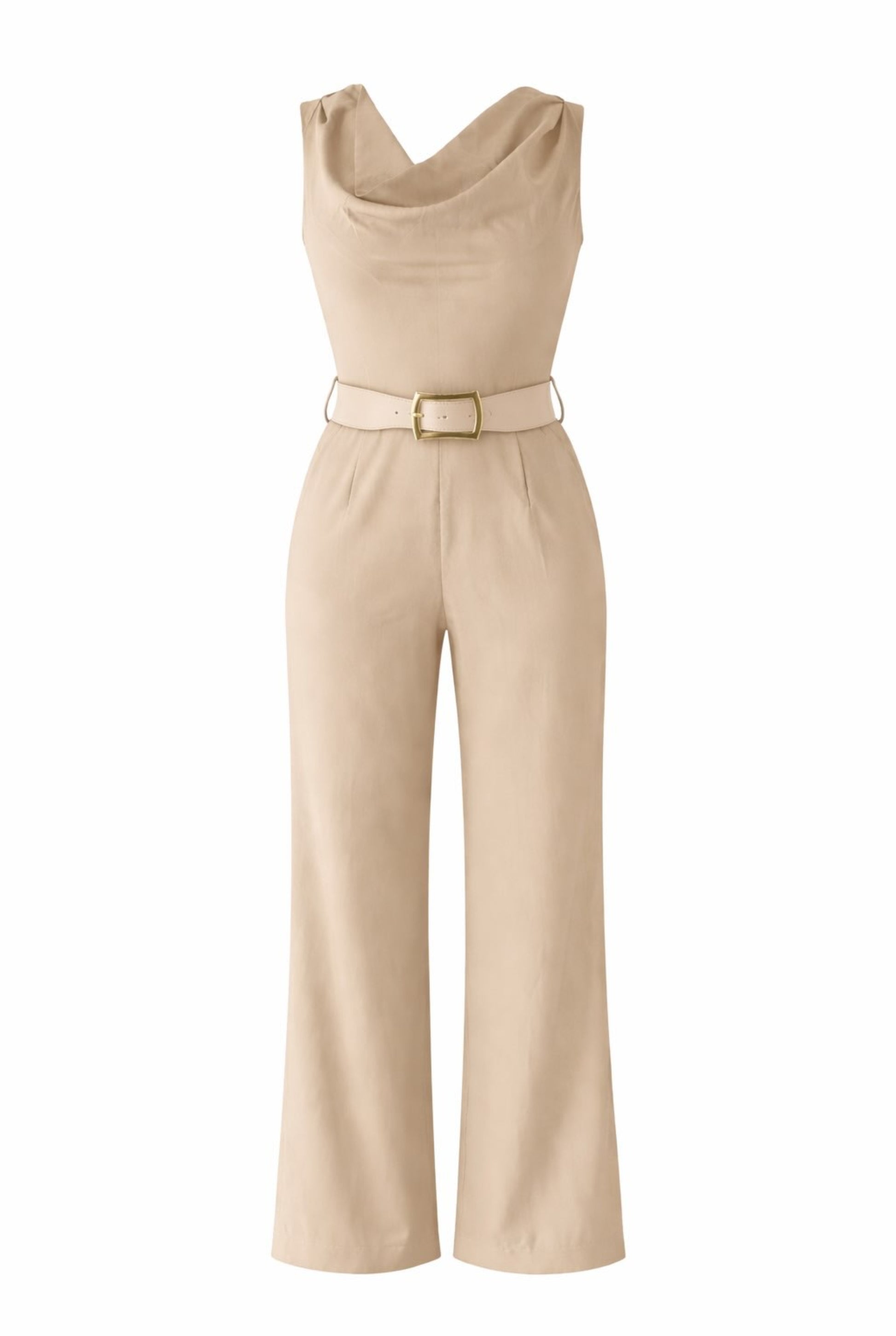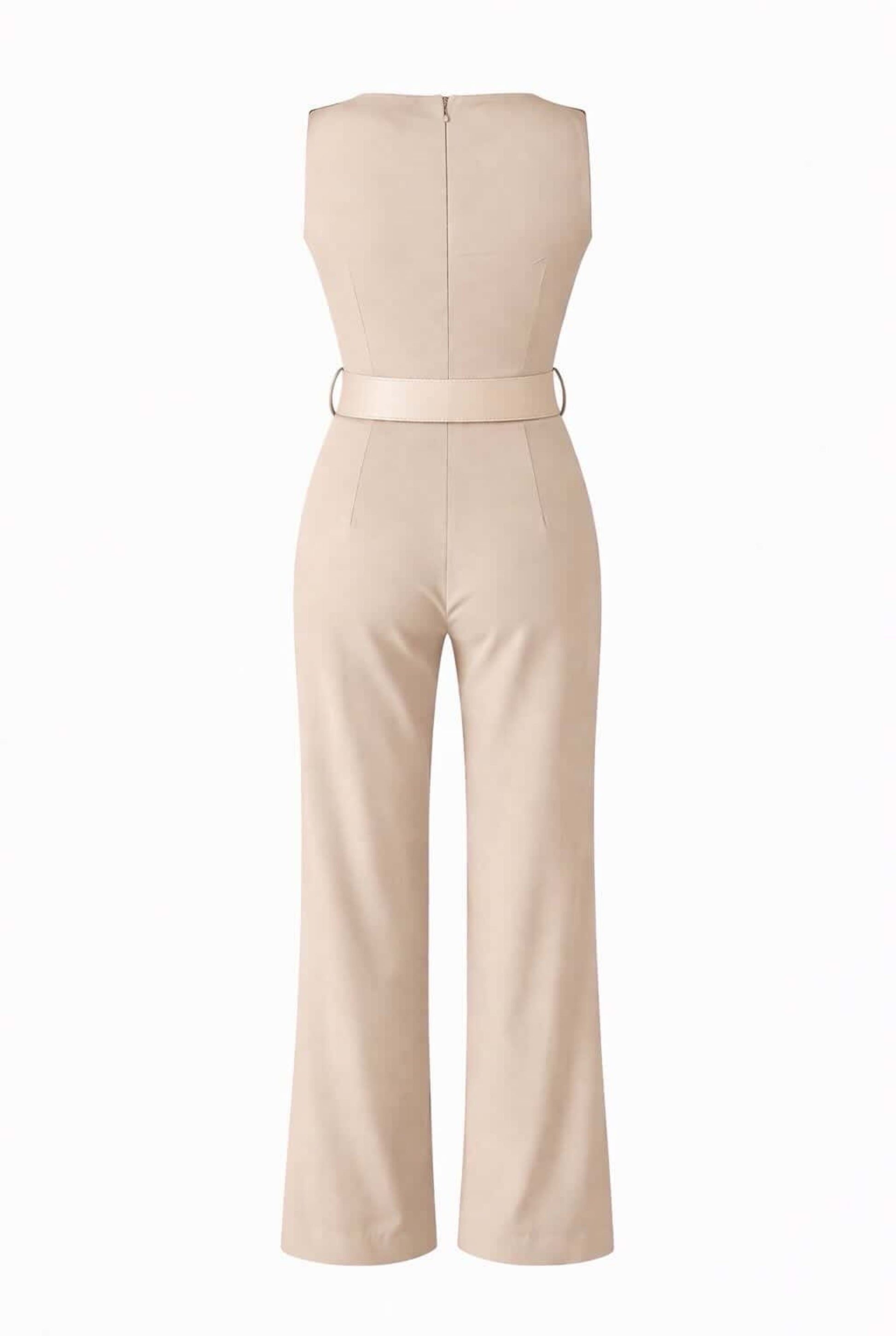 Mono de cuello fluido y manga sisa. Detalle de cinturón ancho. Bolsillos delanteros. Pernera ancha. Cierre lateral con cremallera oculta en costura.
