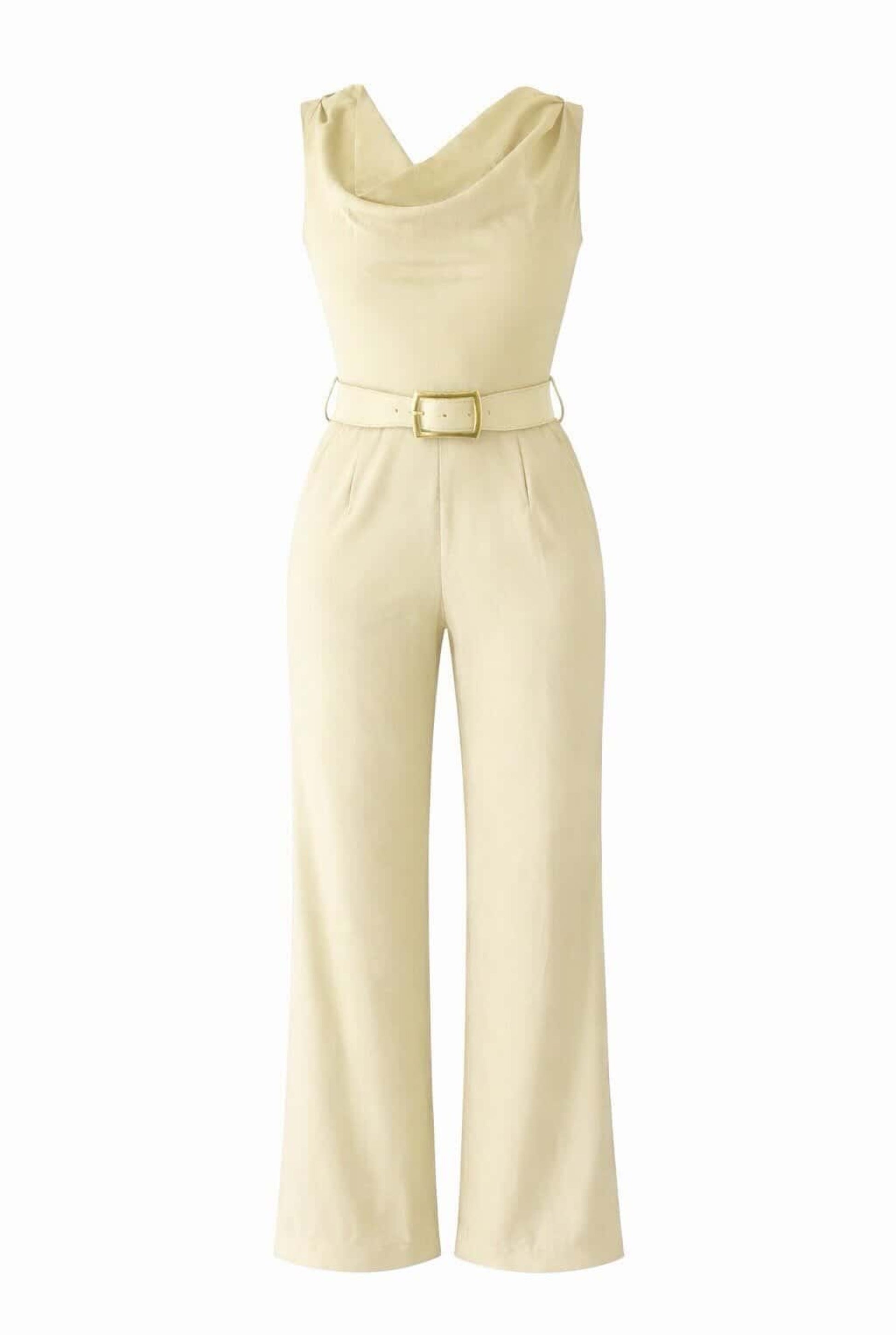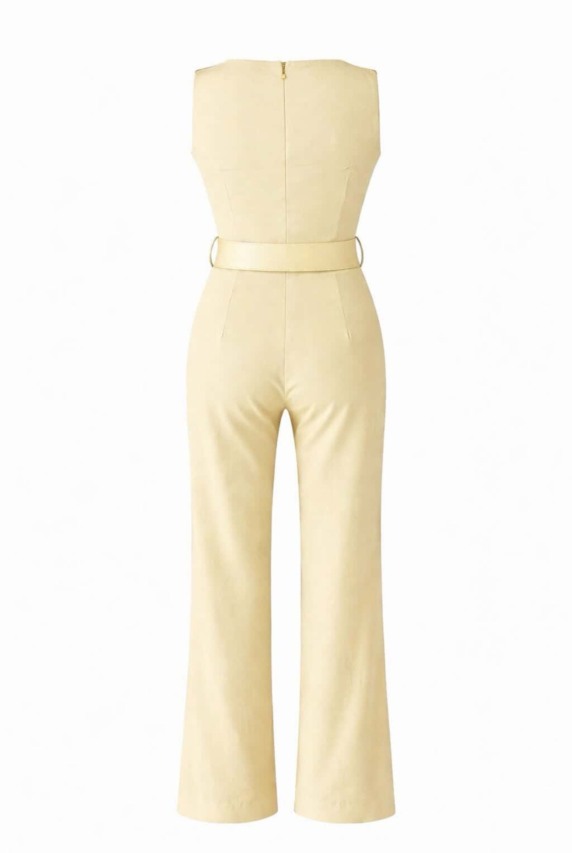 Mono de cuello fluido  y manga sisa. Detalle de cinturón ancho. Bolsillos delanteros. Pernera ancha. Cierre lateral con cremallera oculta en costura.