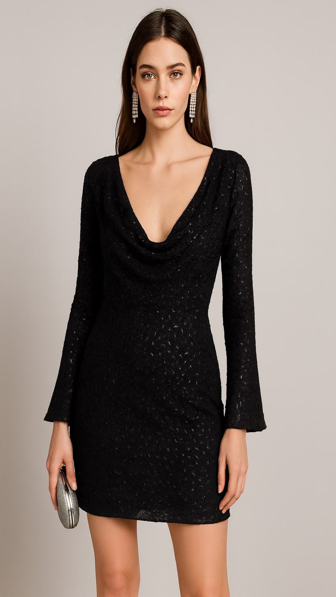 Vestido corto con magas largas tipo flare. Detalle de aplicación de abalorios del mismo tono y cuello fluido drapeado. Tiene forro interior.