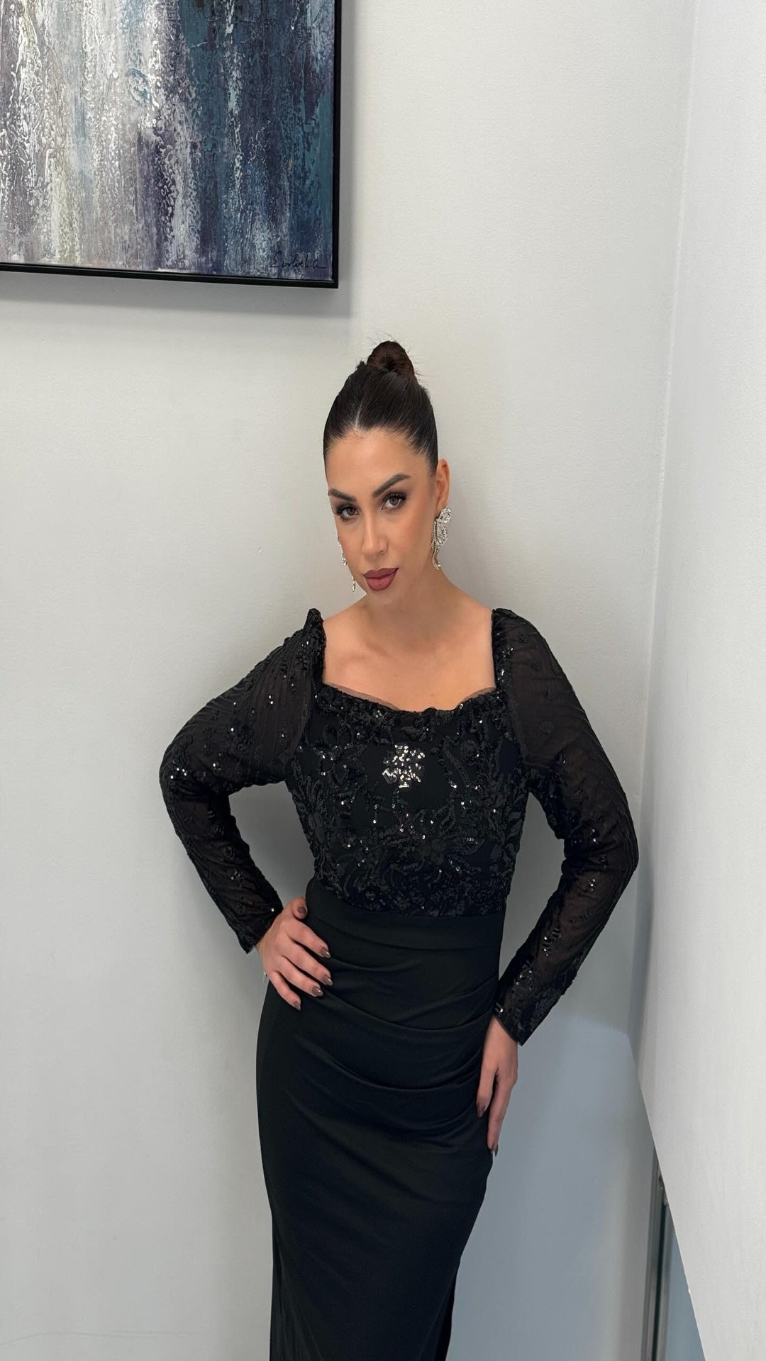 Vestido midi de manga larga. La parte de arriba semitransparente con parches de lentejuelas de diseño floral. La parte de abajo confeccionado en lycra con detalle fruncido con abertura lateral. Cierre con cremallera